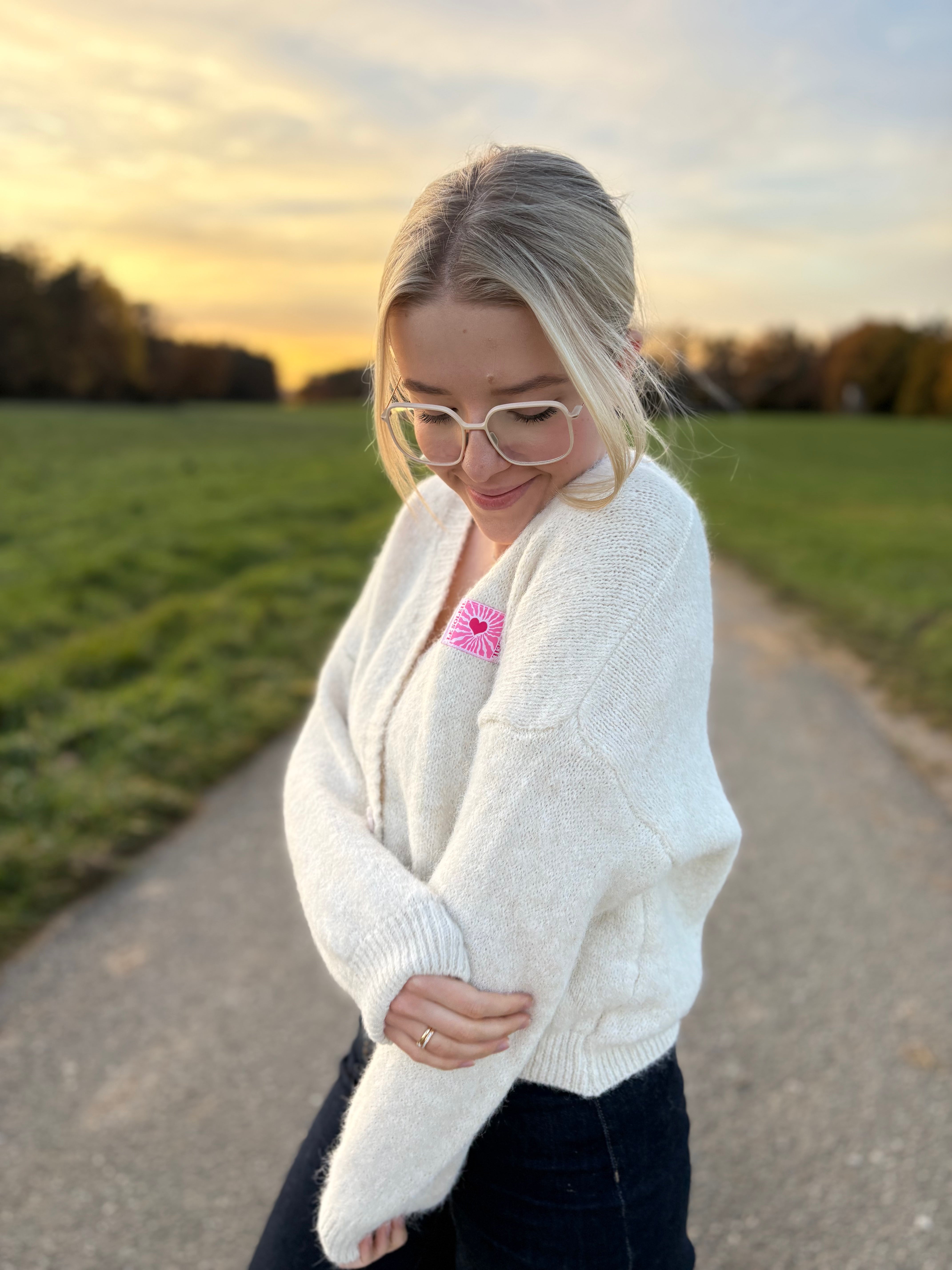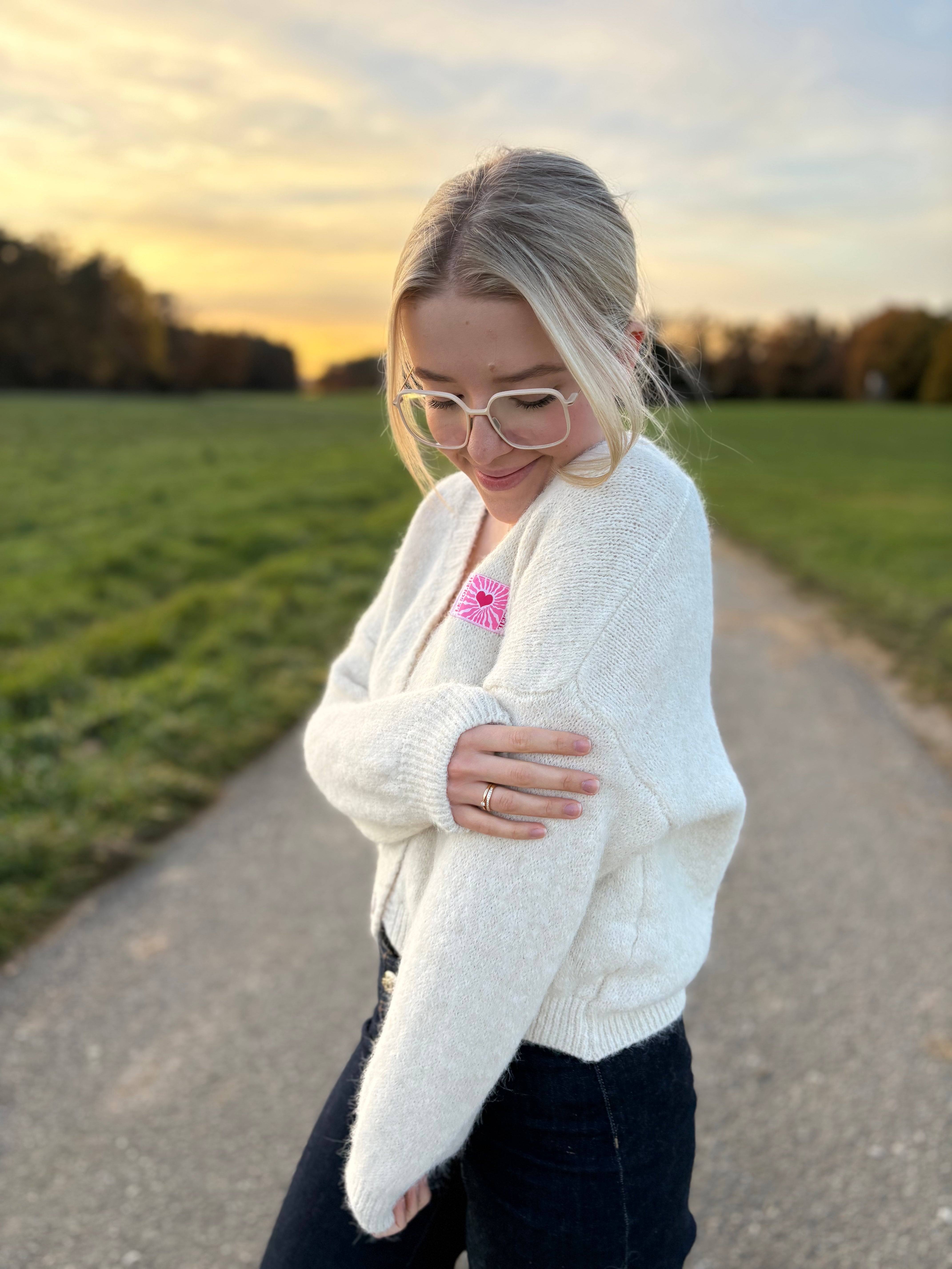 Cardigan „Laura“ mit Le Soleil Patch – Beige/Ecru – Herzknöpfe – Made in Italy