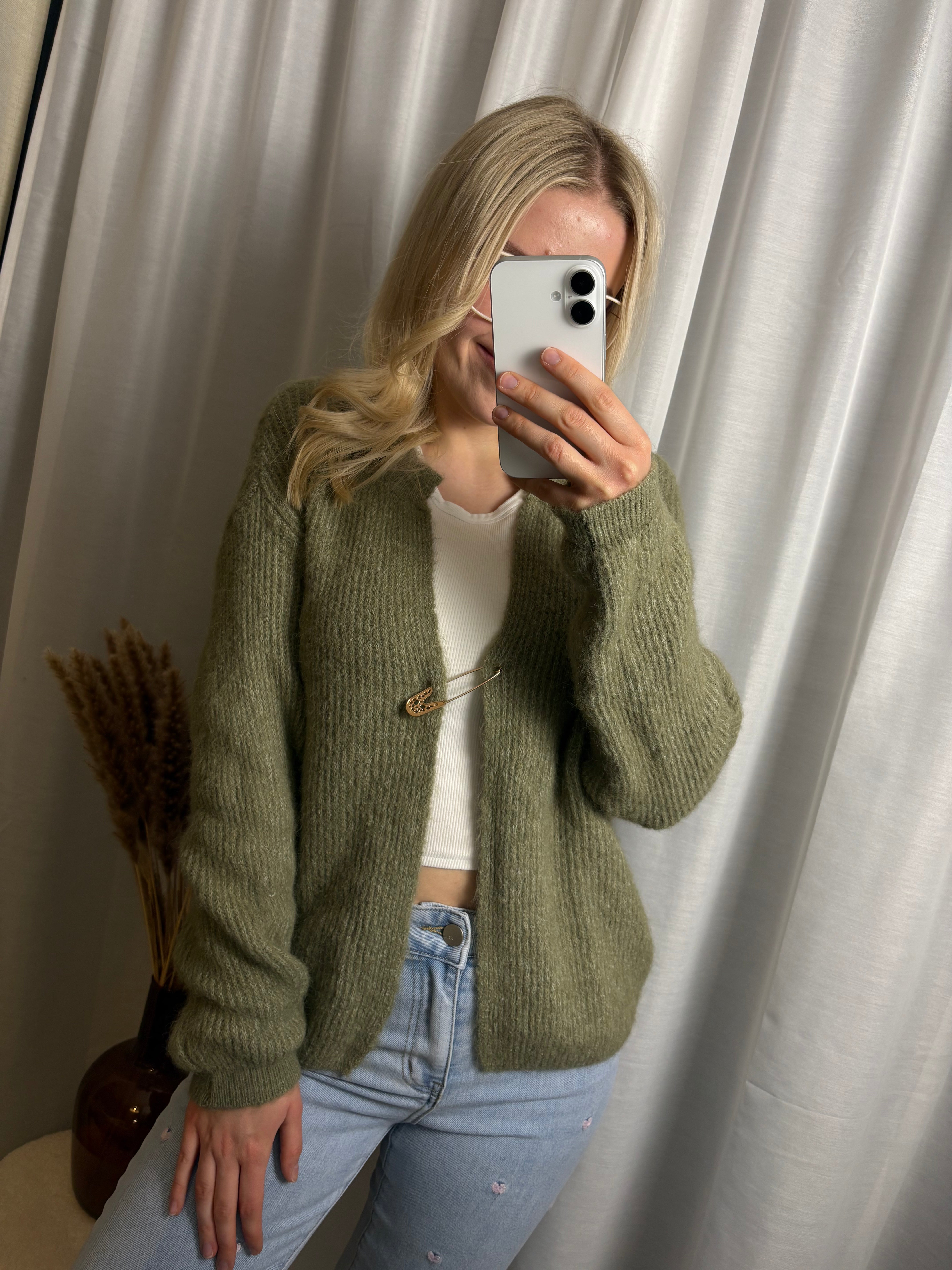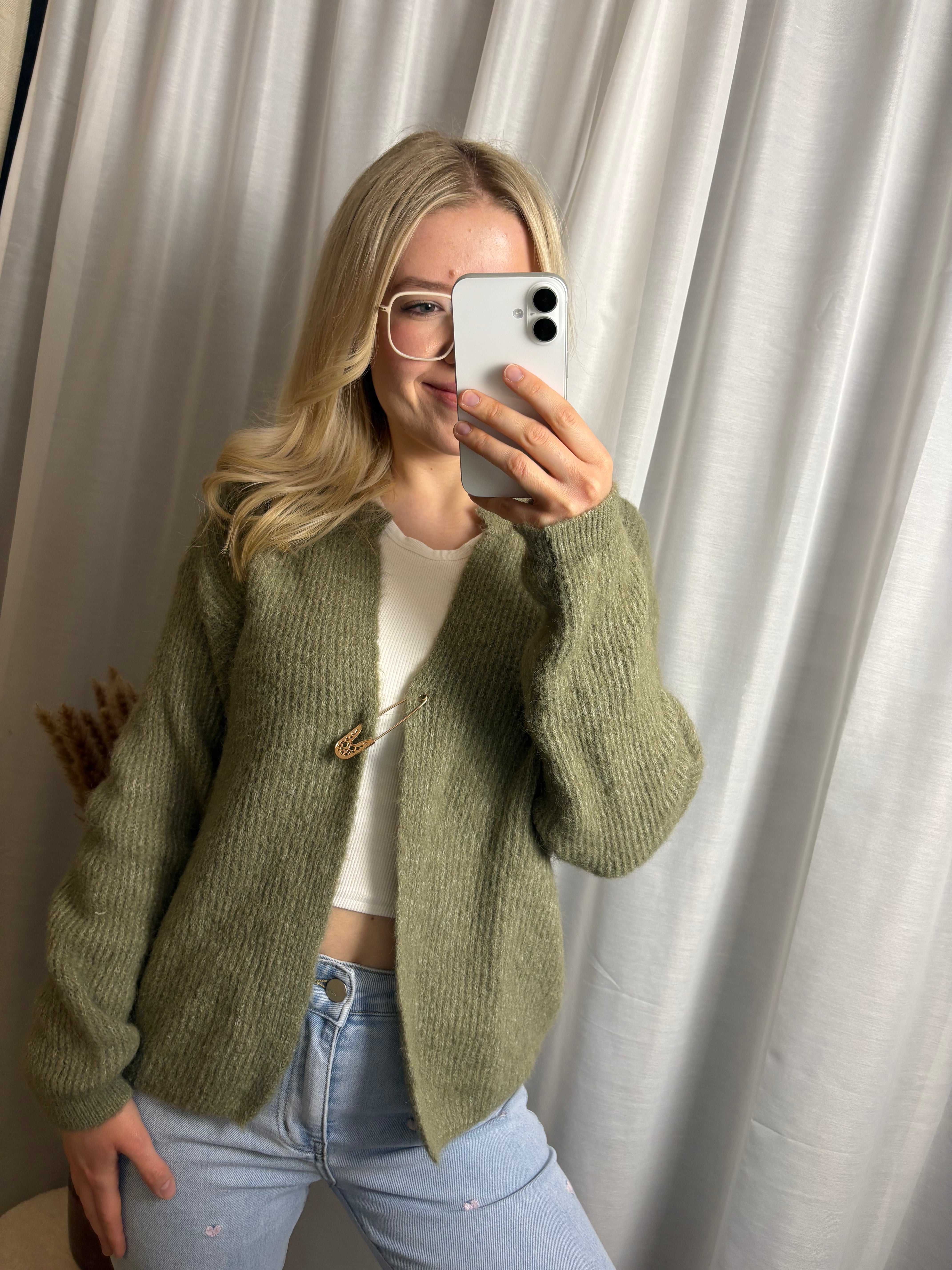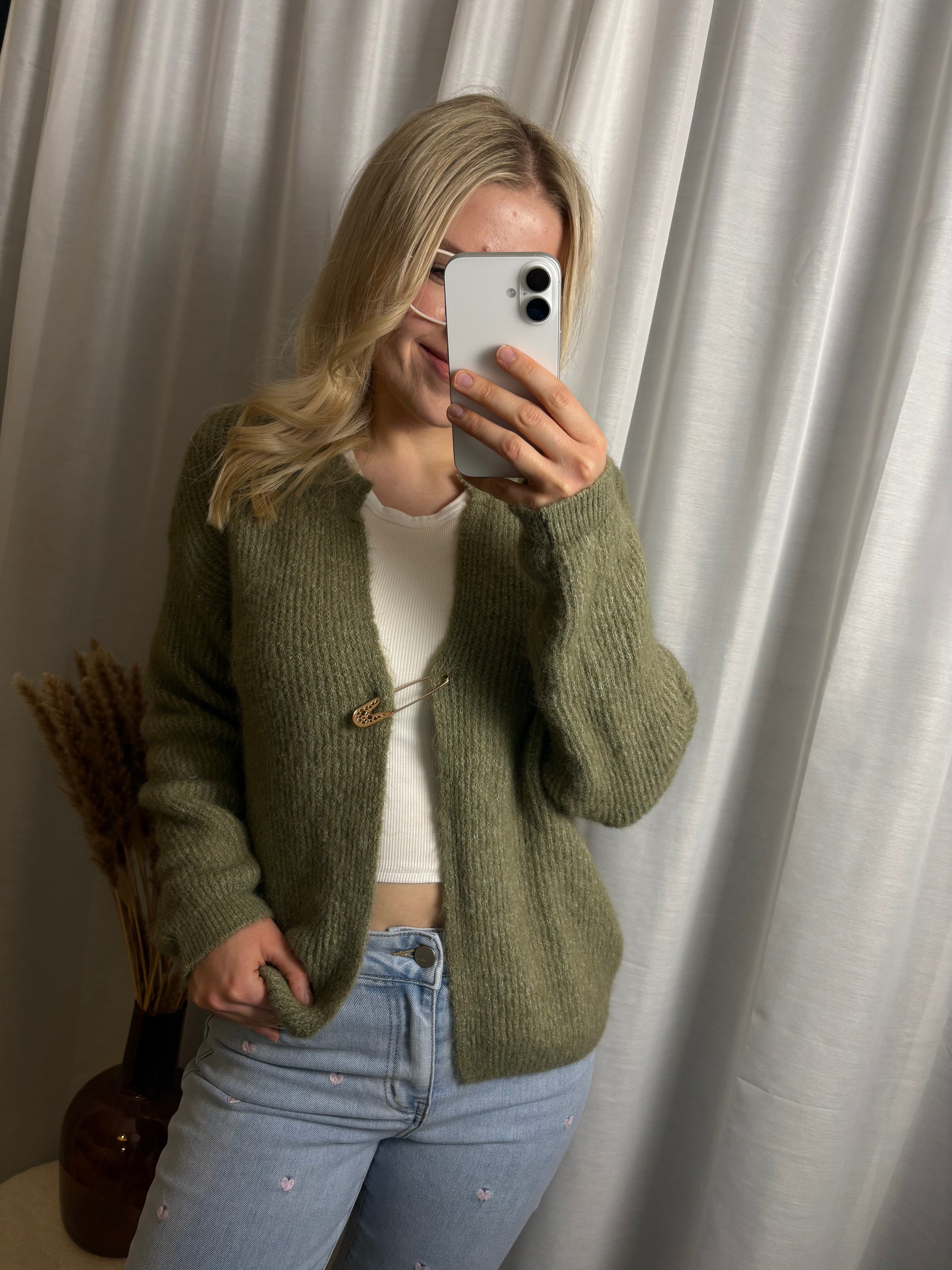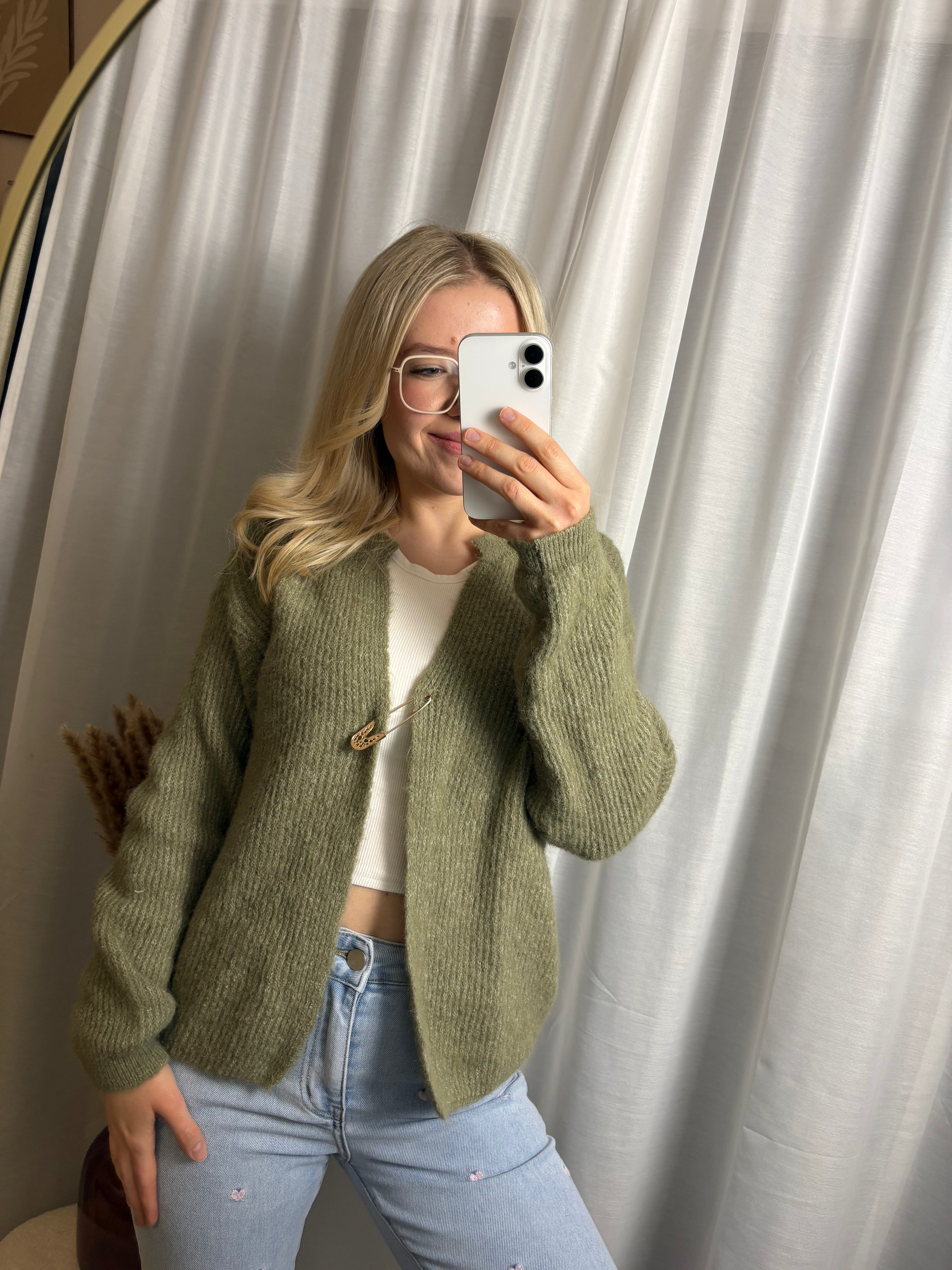 Dieser Cardigan überzeugt mit modernem Design und hochwertigen Materialien aus Italien. Cardigan in Khaki und Gelb Verschluss mit dekorativer Sicherheitsnadel... Lesen Sie mehr