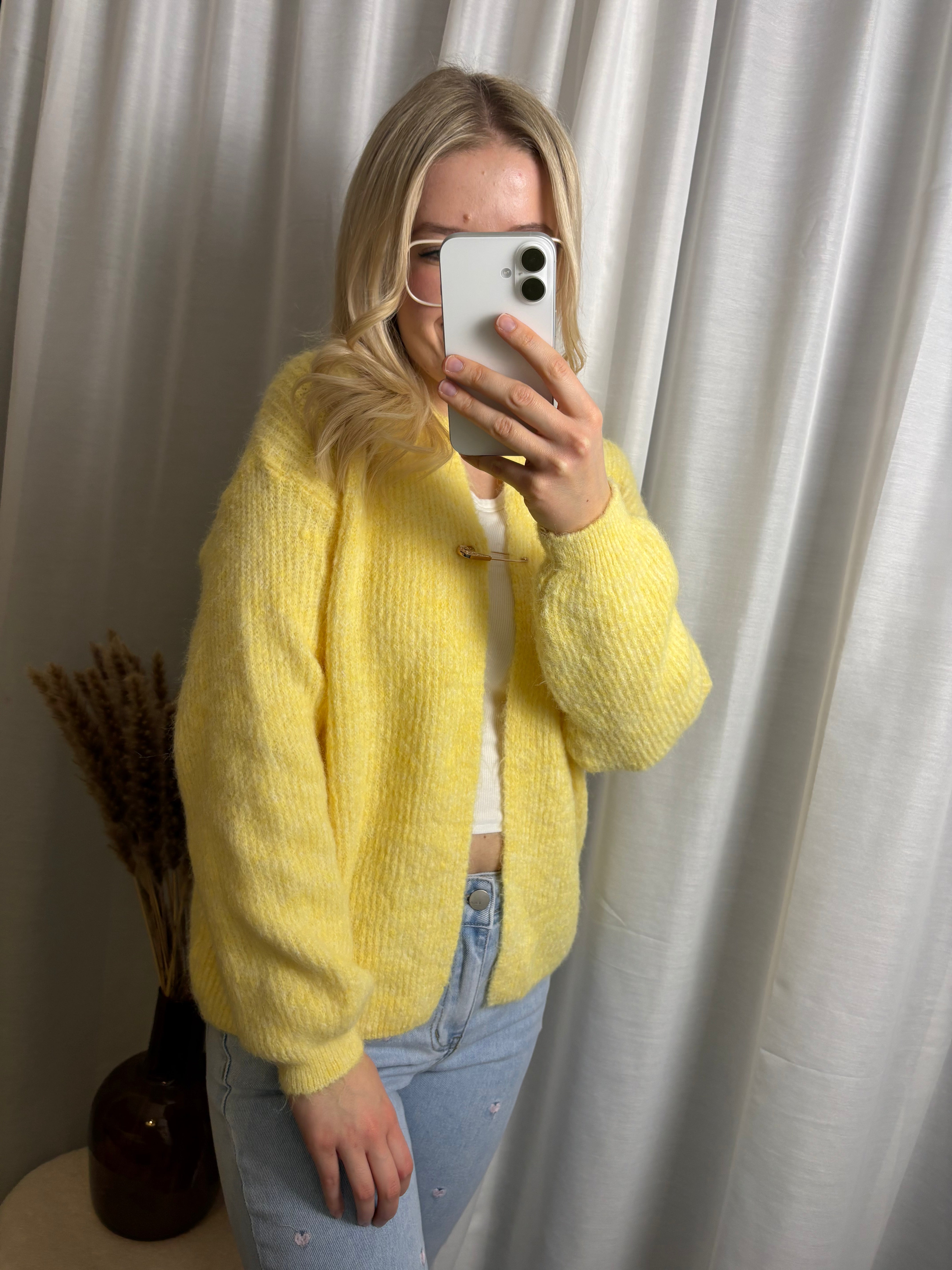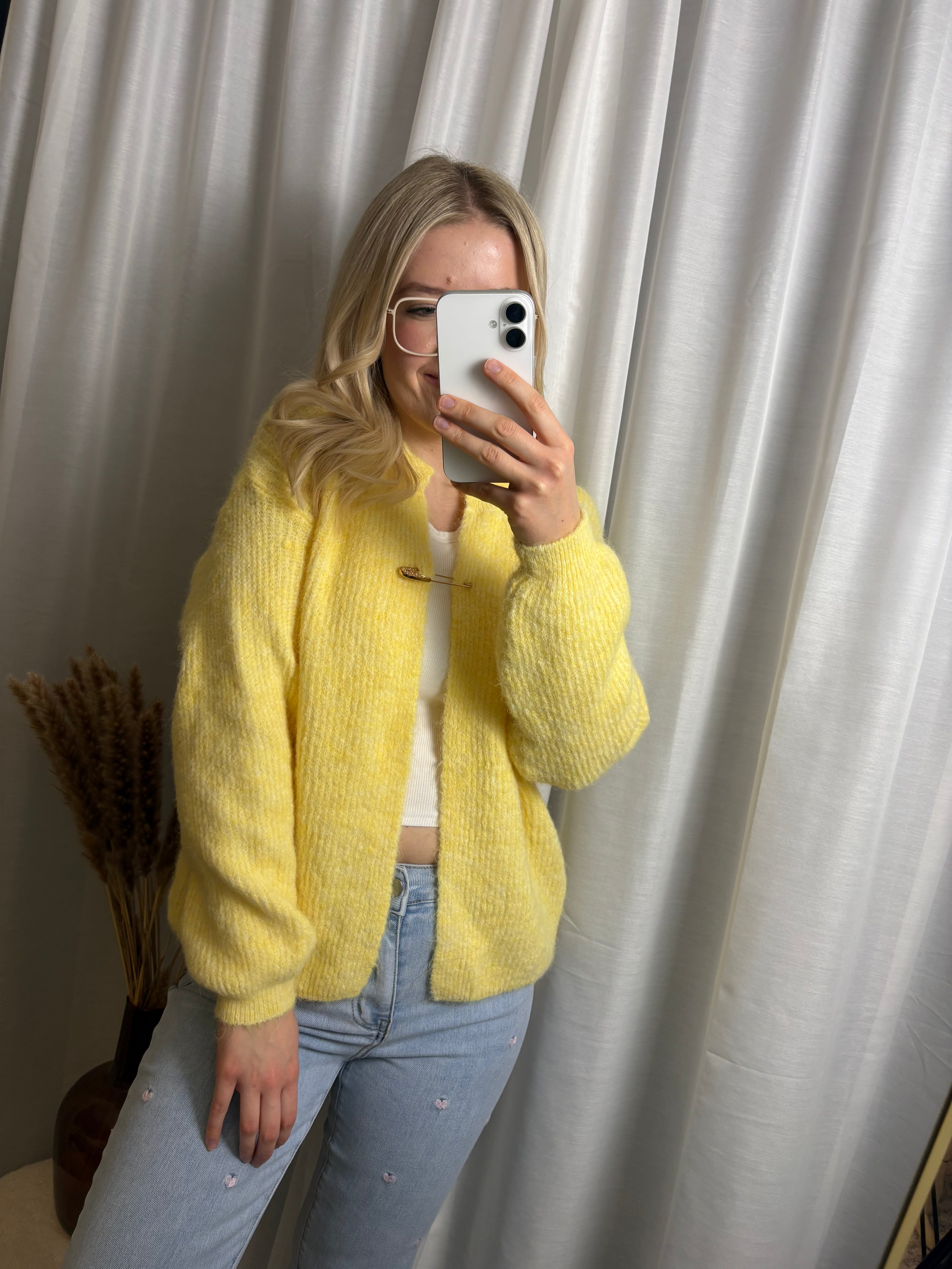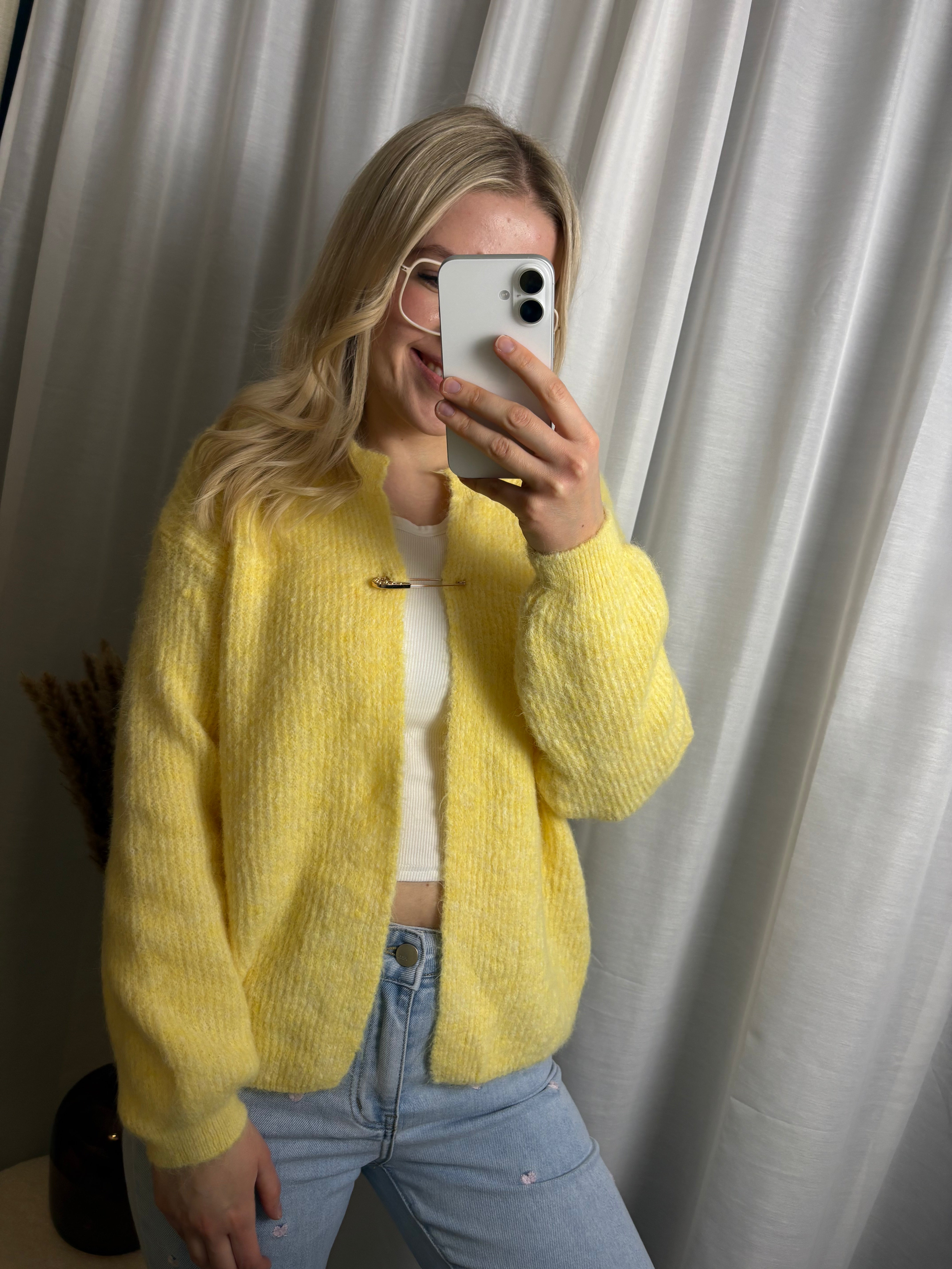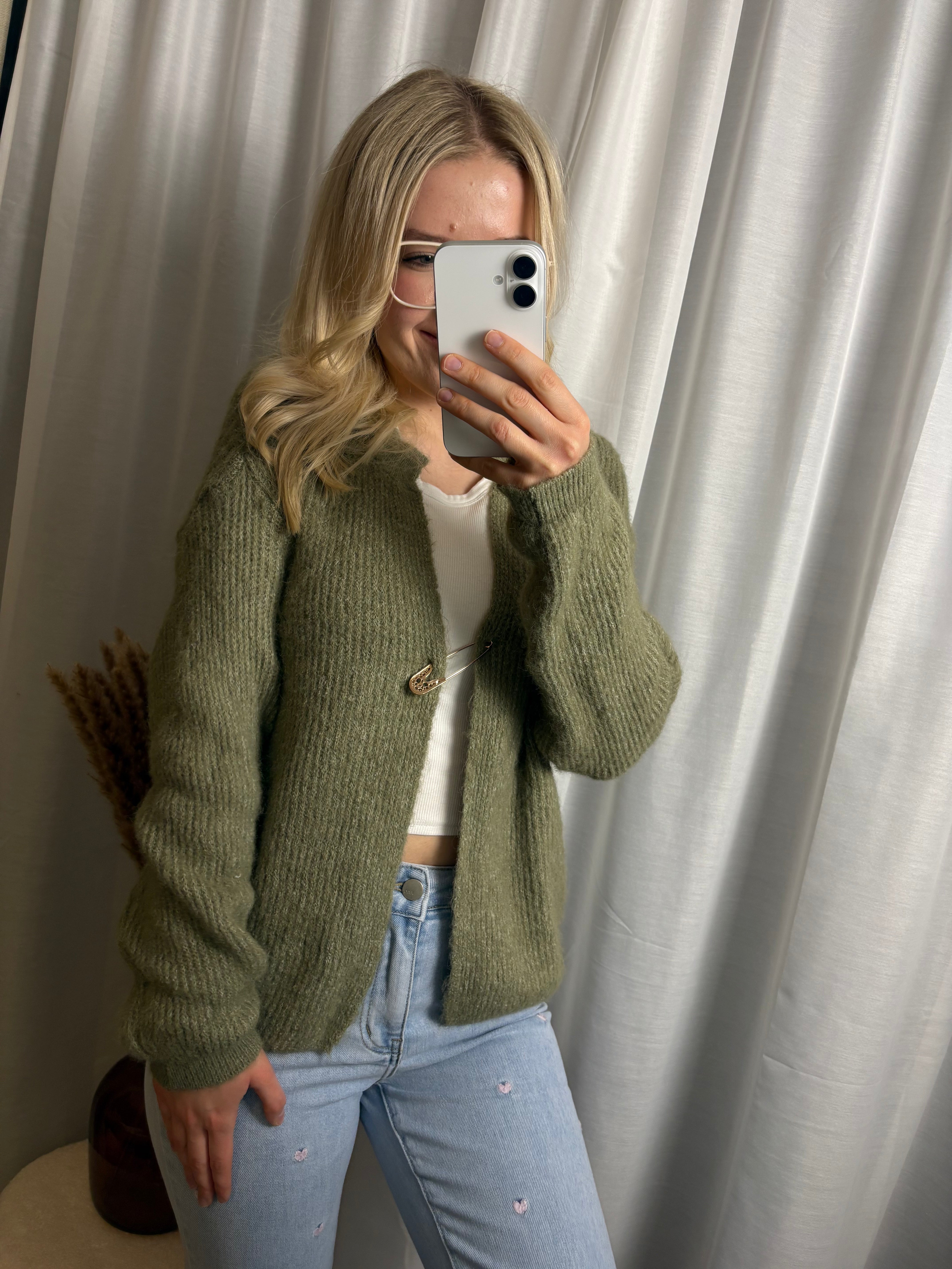 Dieser Cardigan überzeugt mit modernem Design und hochwertigen Materialien aus Italien. Cardigan in Khaki und Gelb Verschluss mit dekorativer Sicherheitsnadel... Lesen Sie mehr