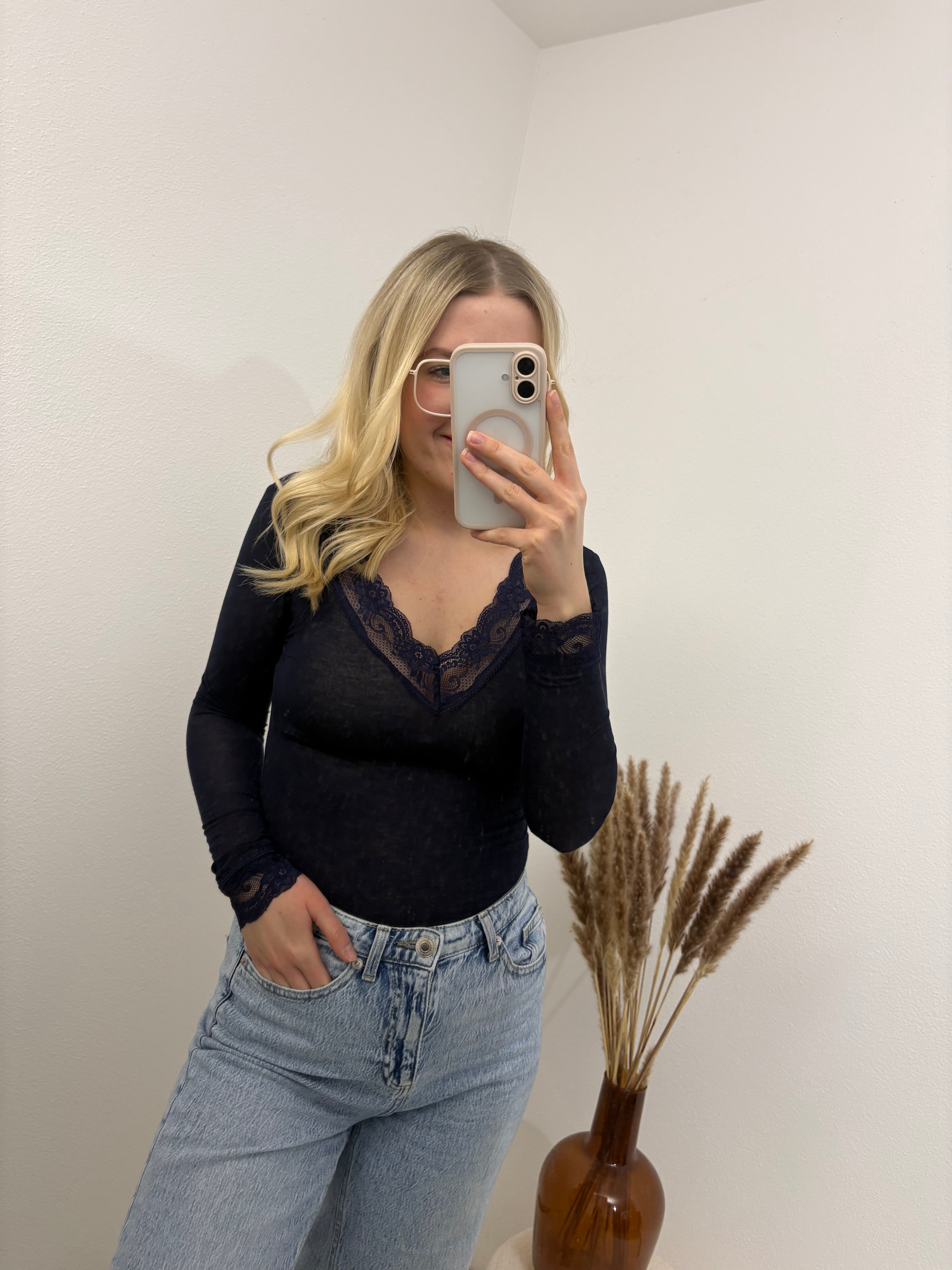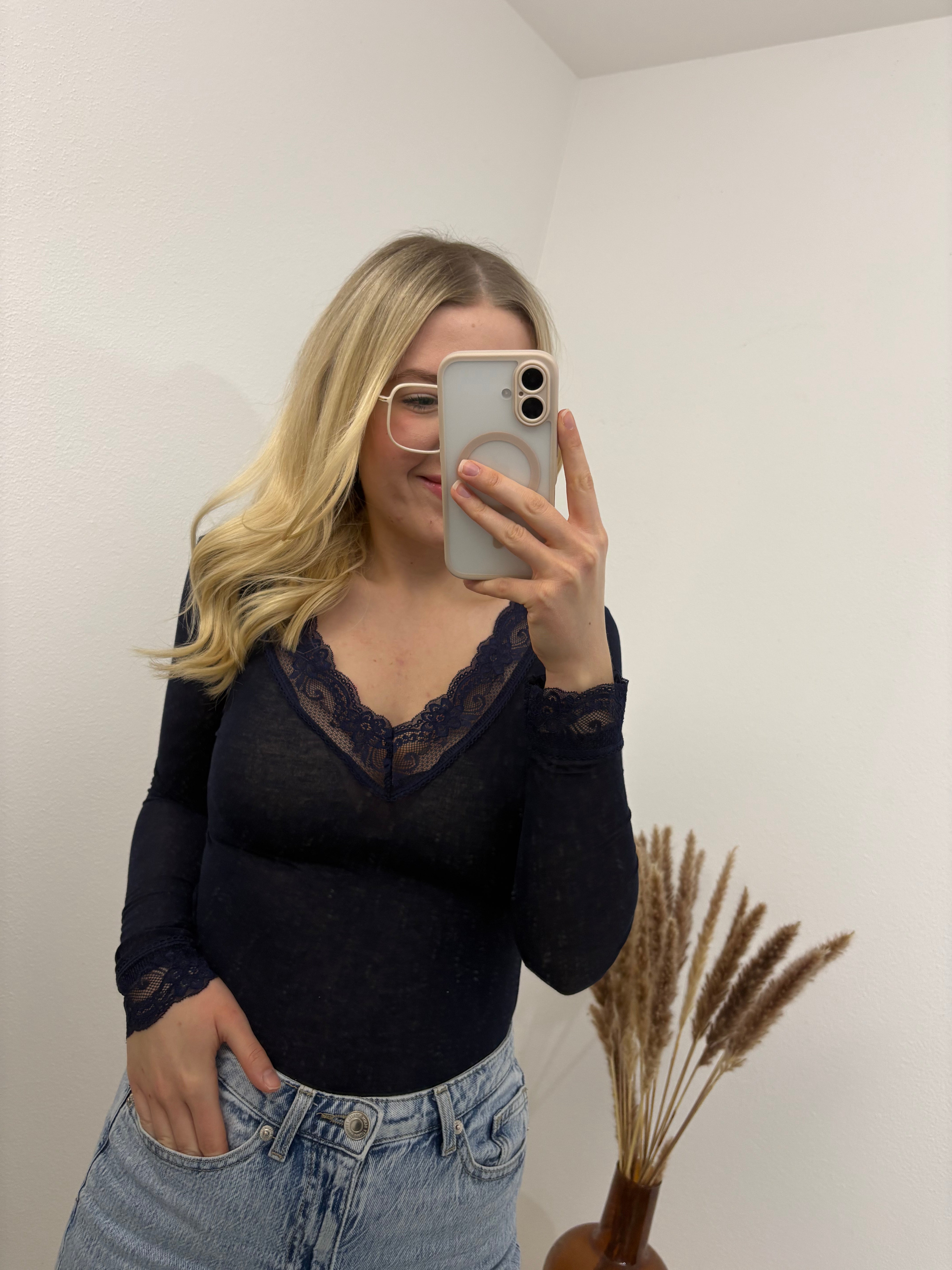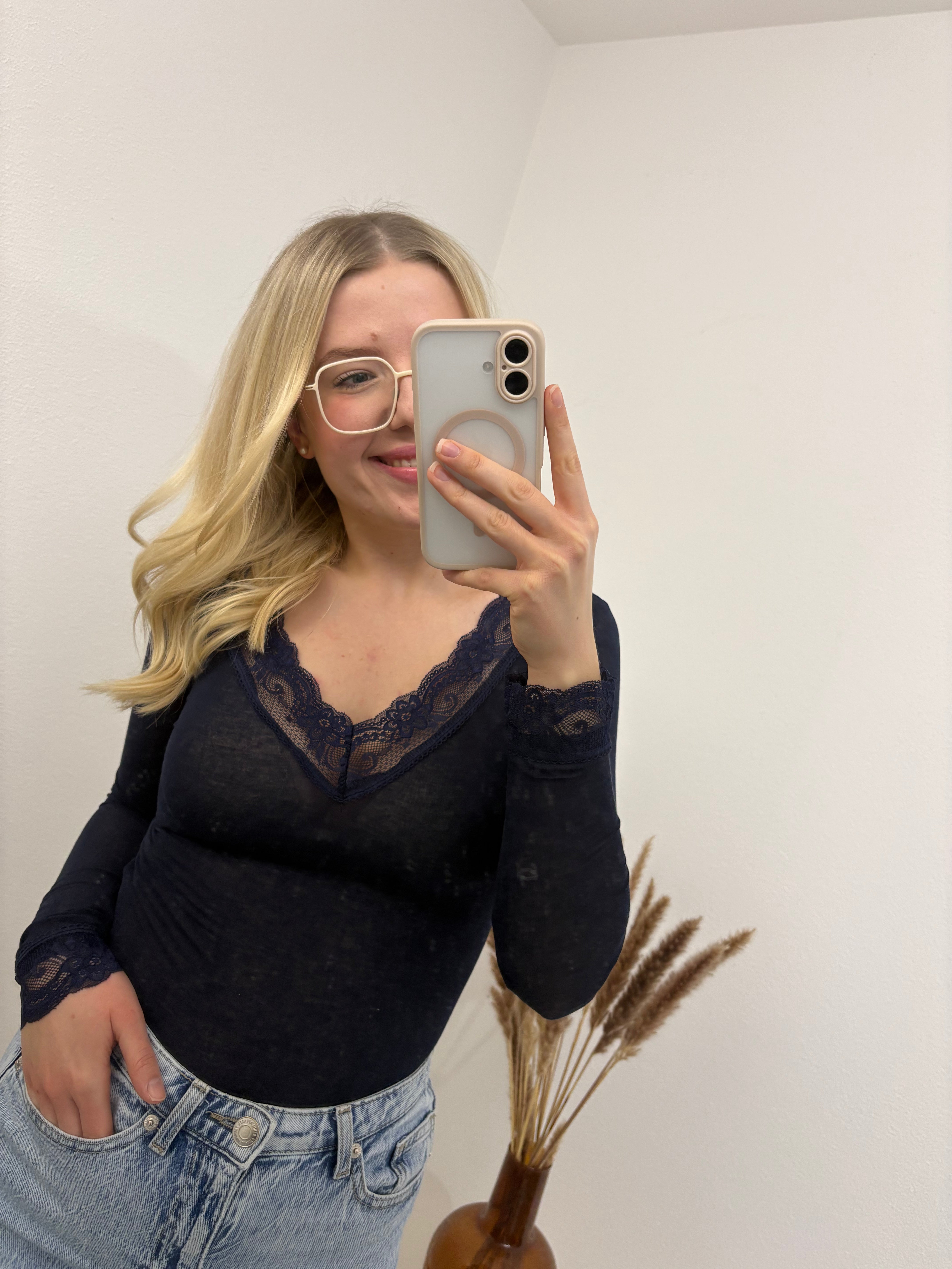 Cashmere Langarmshirt mit Spitze einfarbig Dunkelblau Marine