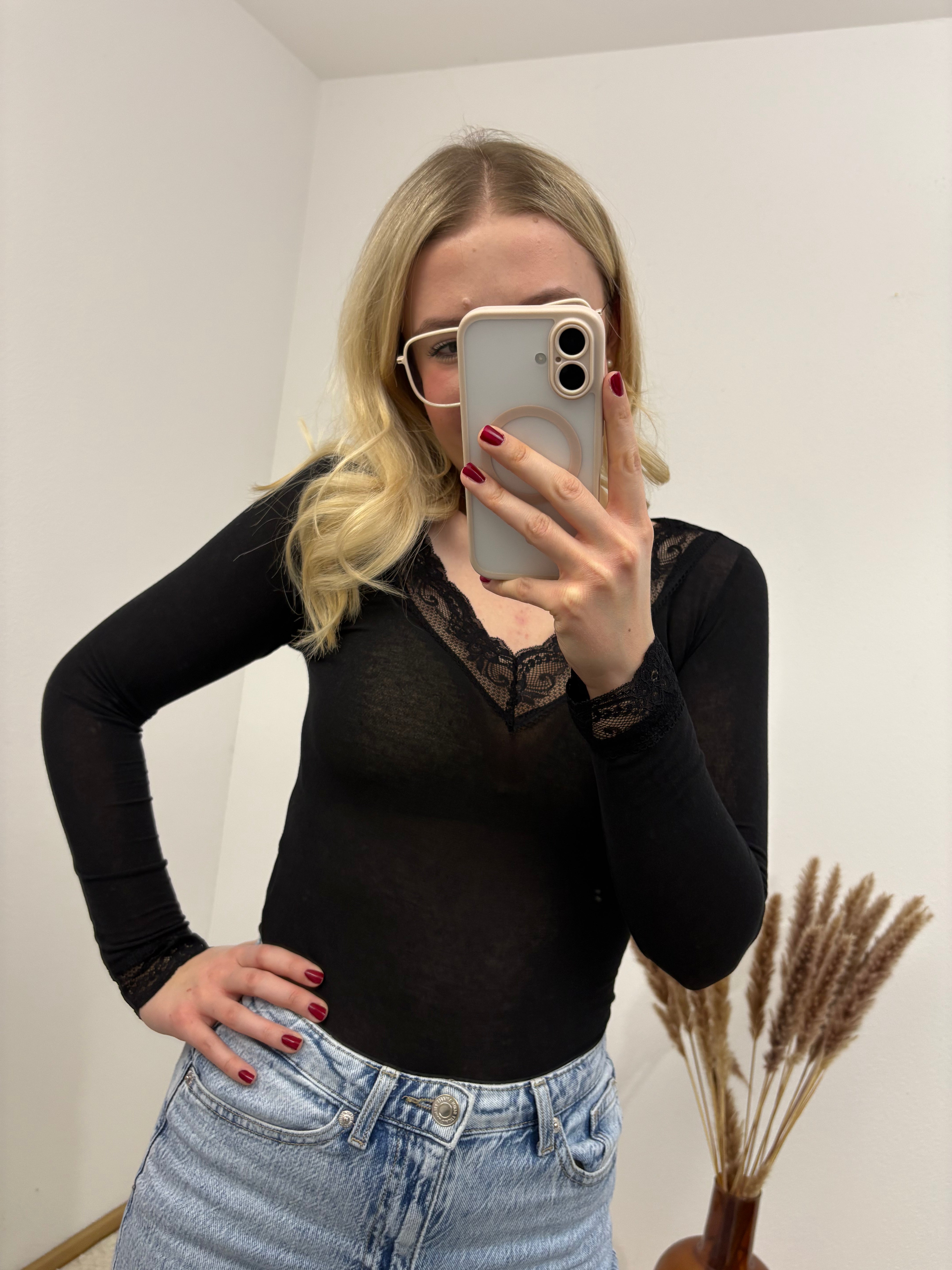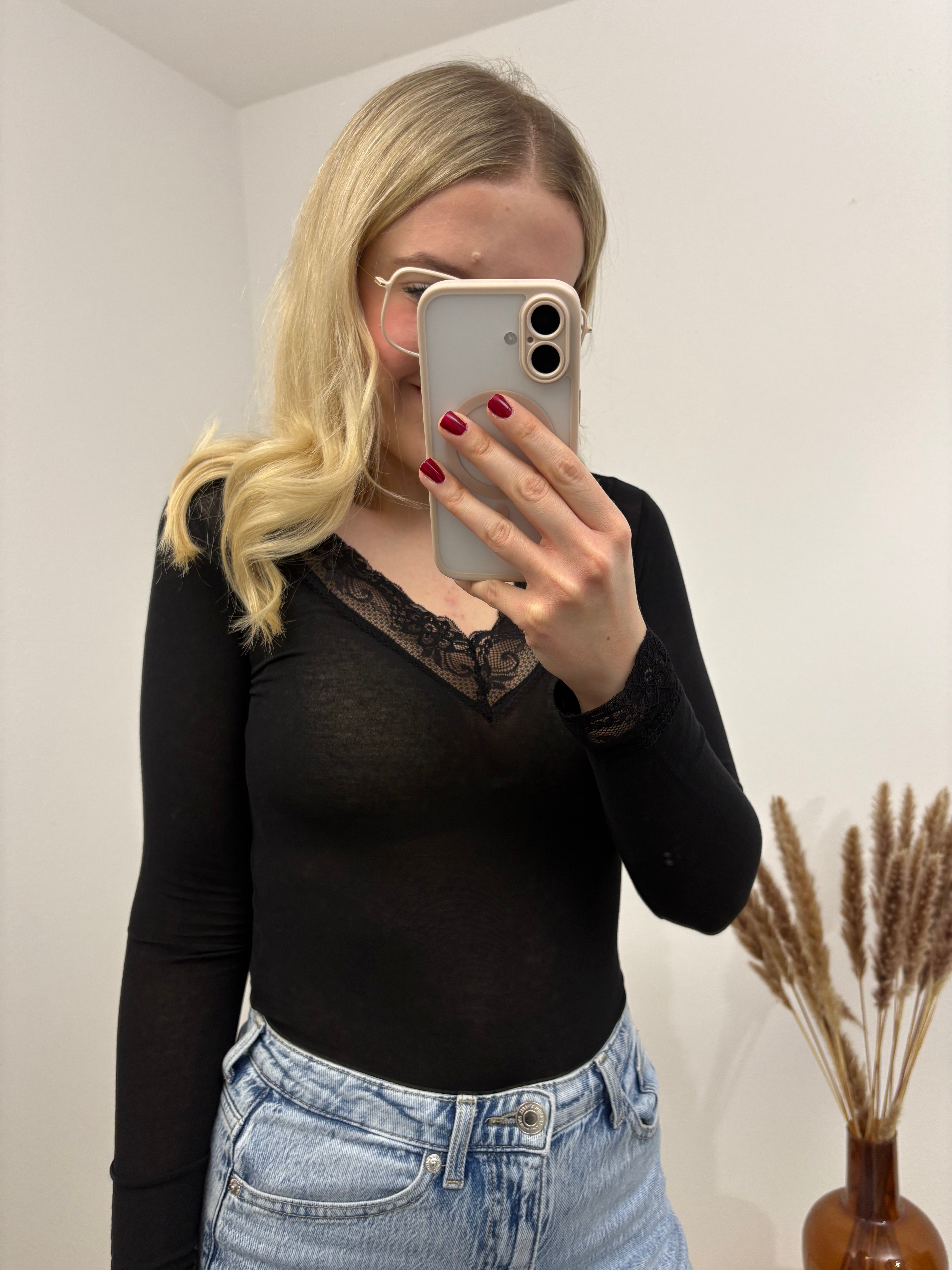 Cashmere Langarmshirt mit Spitze einfarbig Schwarz Basic
