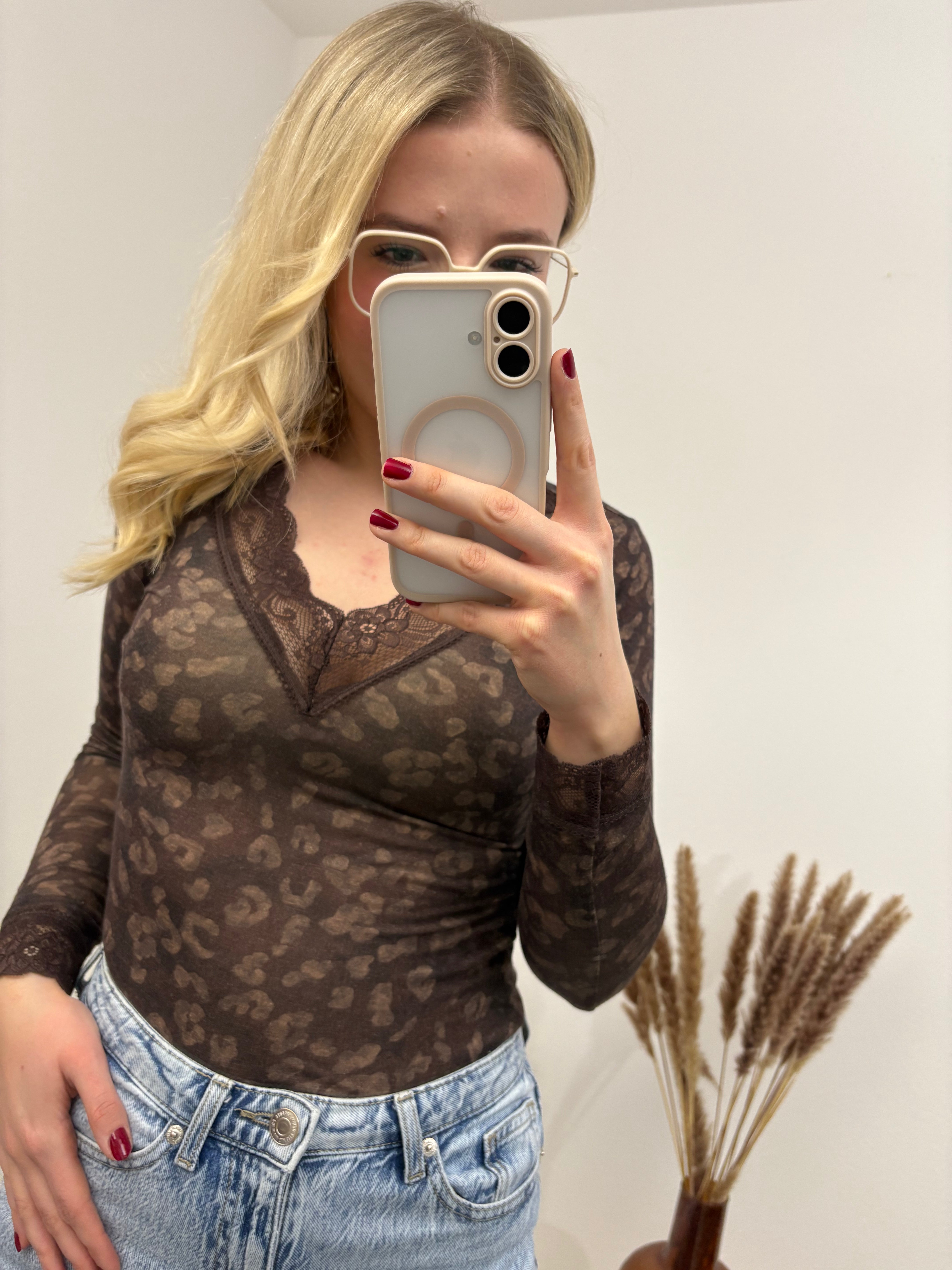 Cashmere Langarmshirt mit Spitze Leo Braun Dunkelbraun