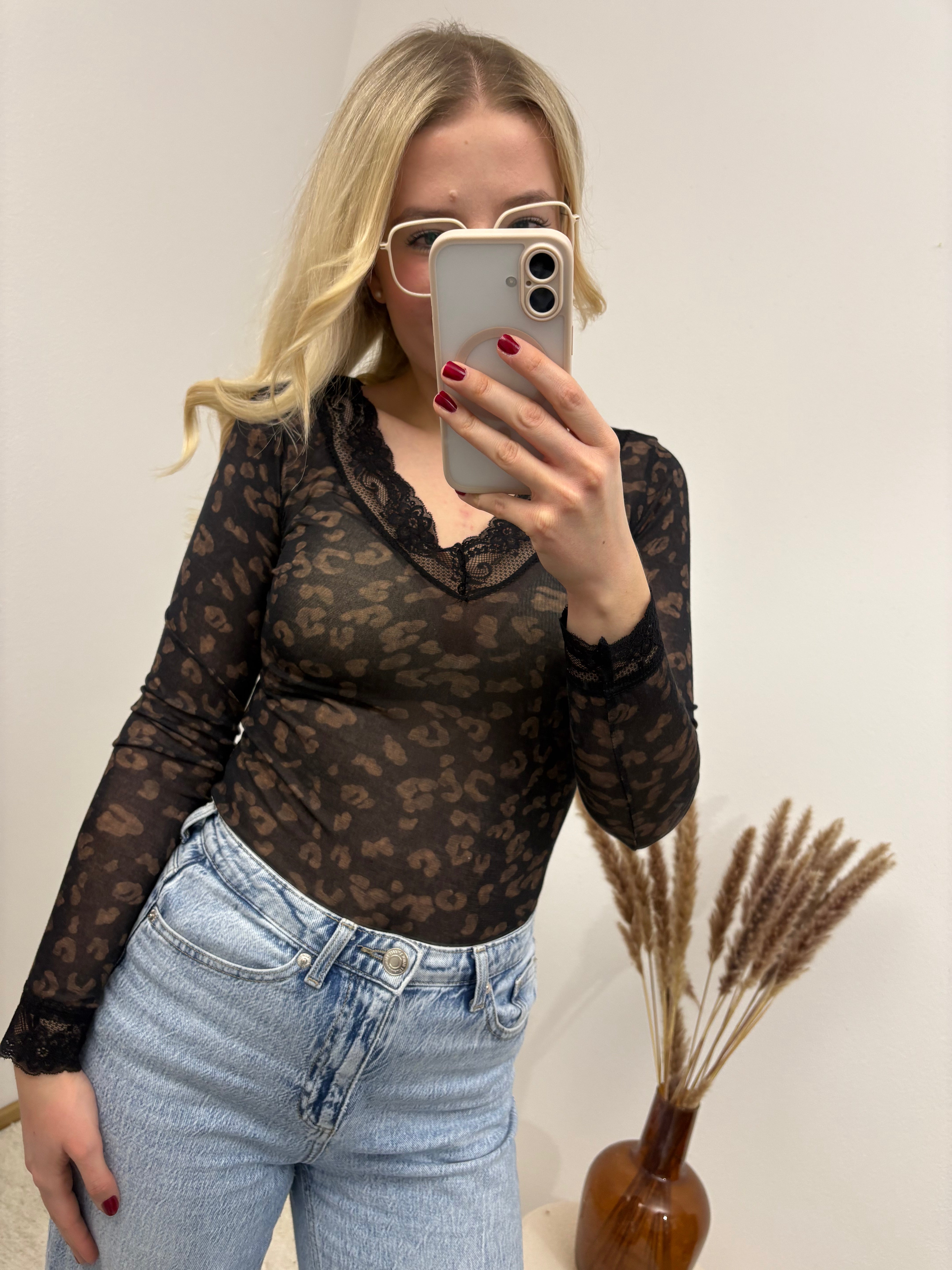 Cashmere Langarmshirt mit Spitze Leo Schwarz