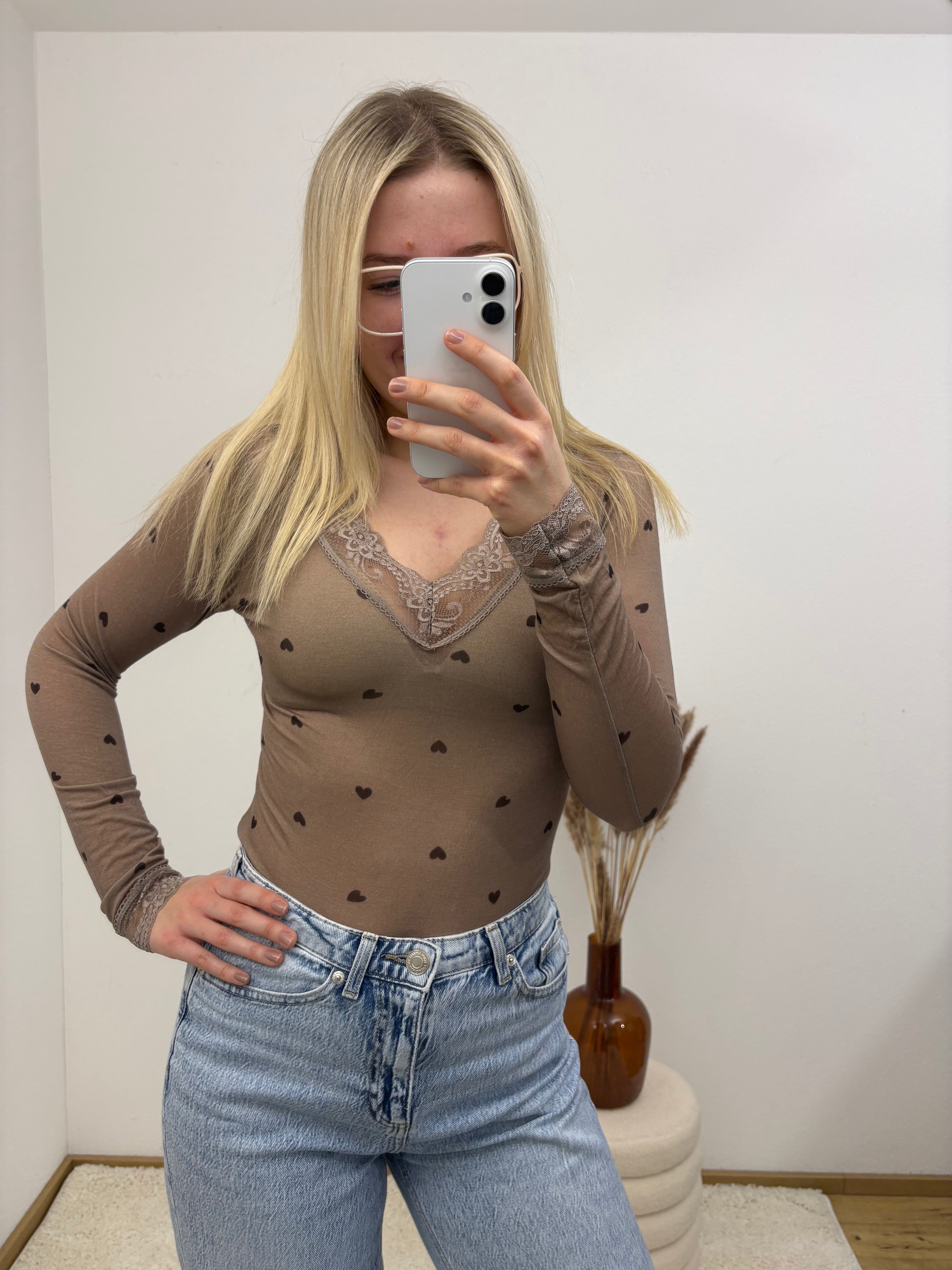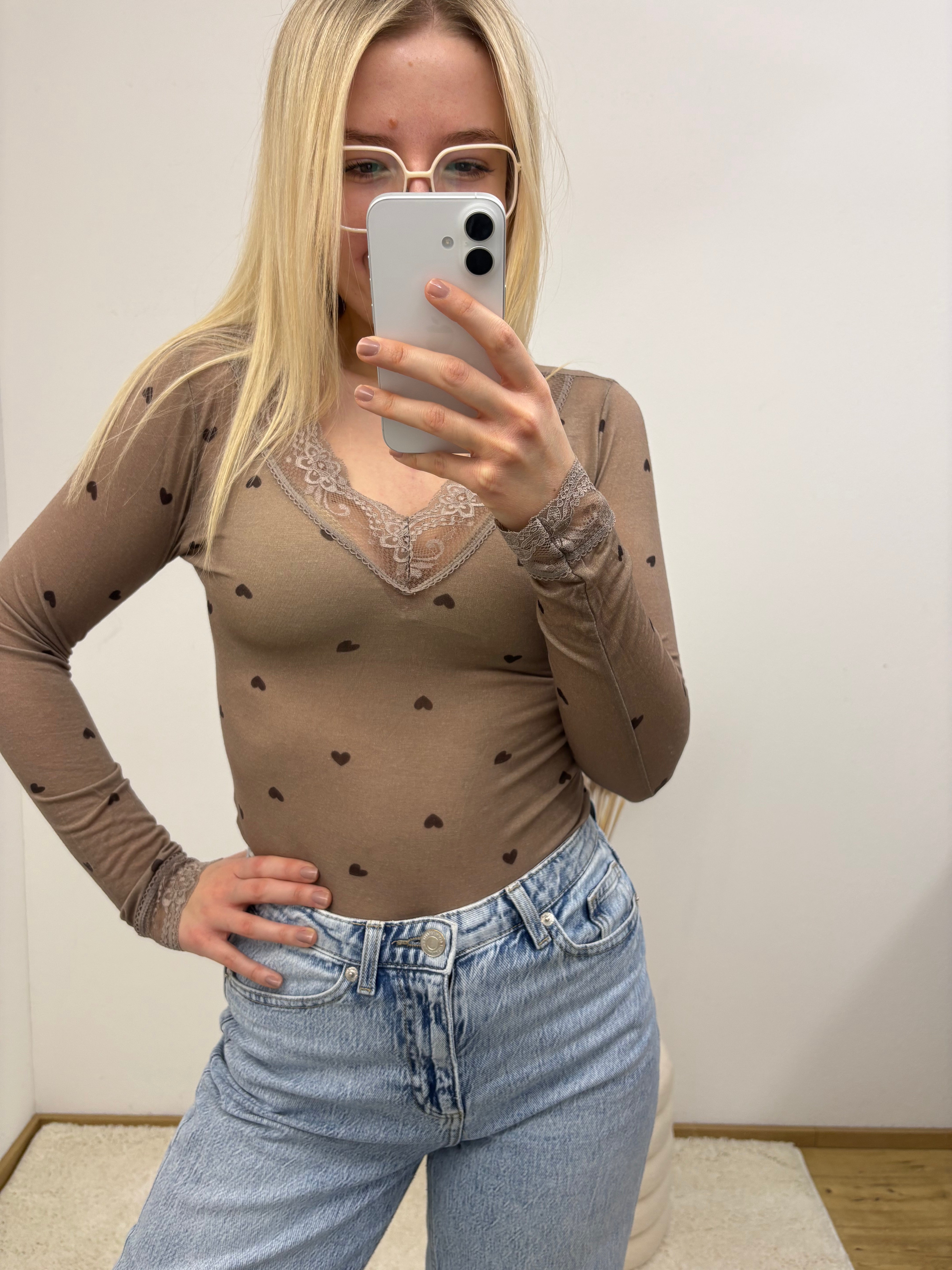 Cashmere Langarmshirt mit Spitze Little Hearts Herzen Taupe
