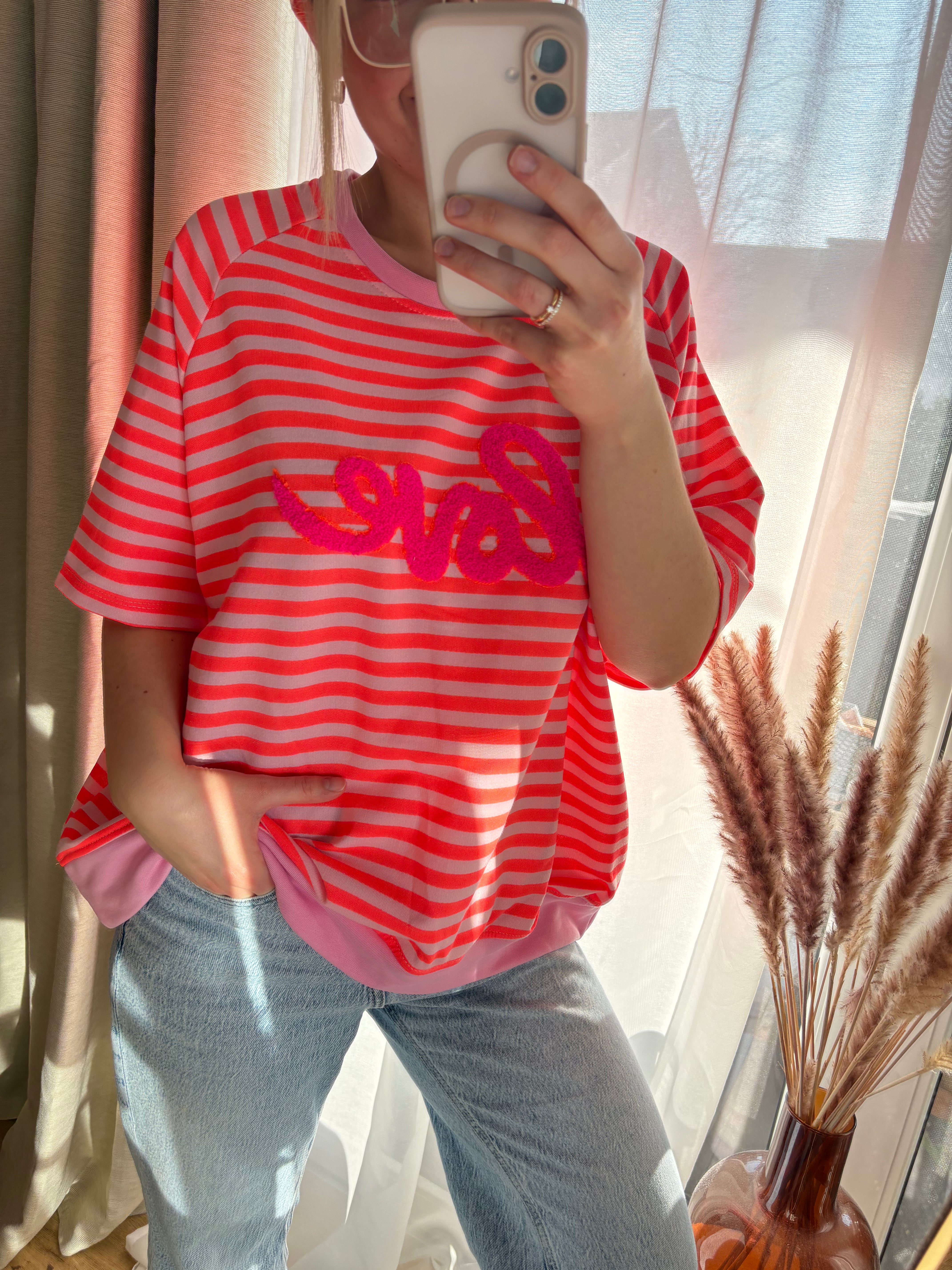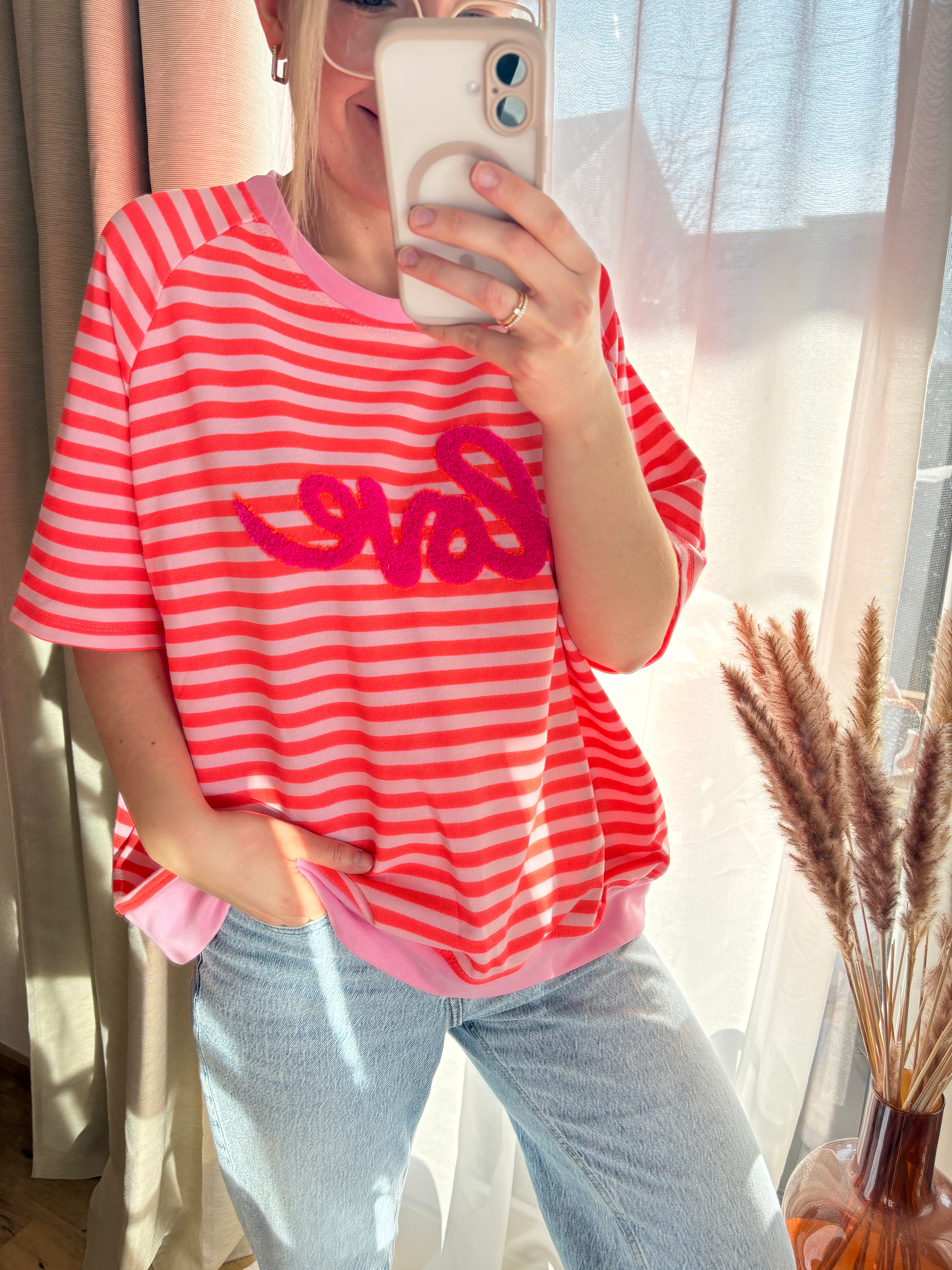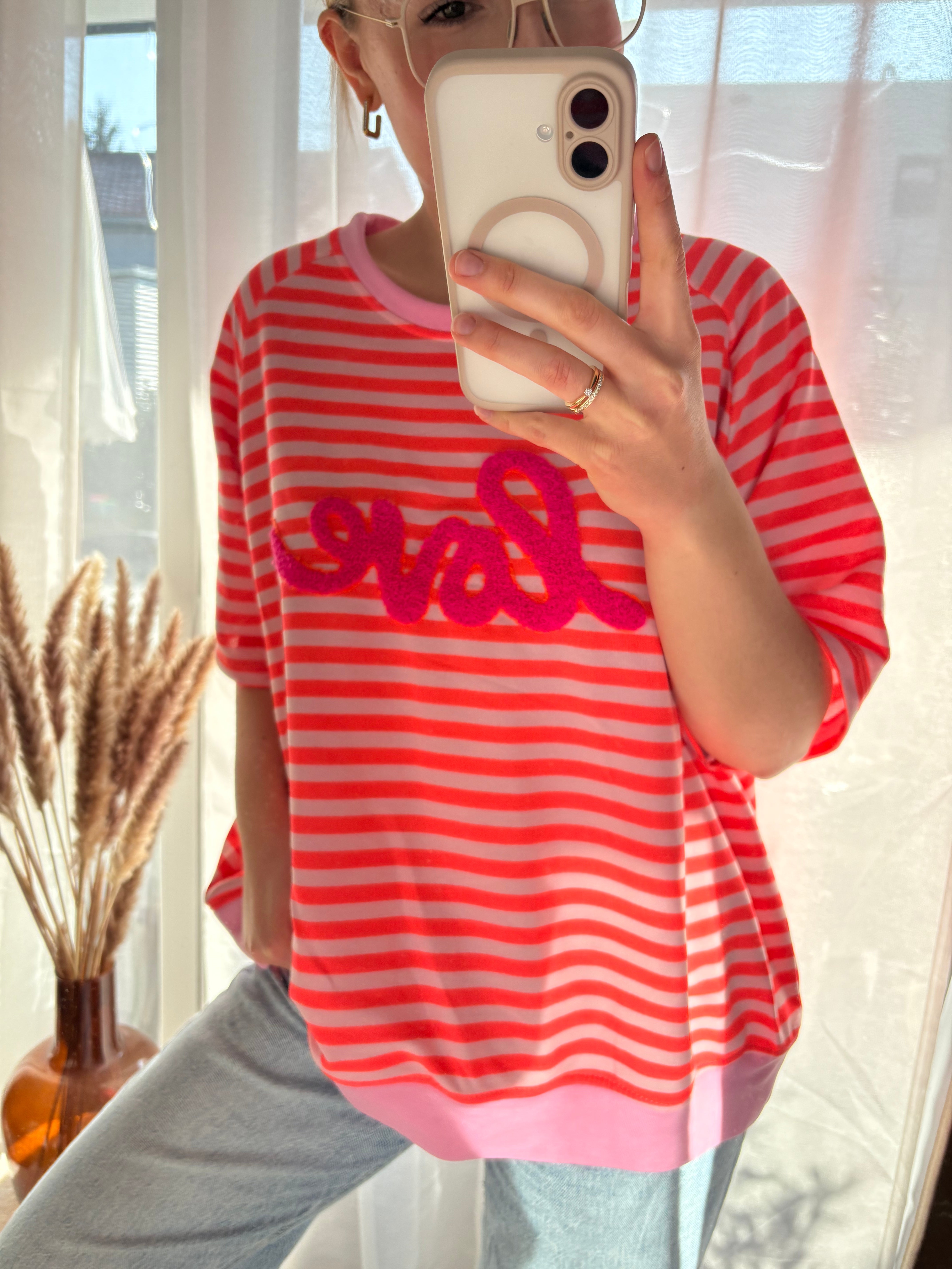 Dieser Kurzarm-Sweater „Love“ in Rosa-Neon-Pink kombiniert auffällige Streifen mit weichem Tragekomfort. Kurzarm-Sweater mit „Love“-Motiv Farbvariante: Rosa-Neon-Pink gestreift Angeraute Baumwolle für... Lesen Sie mehr