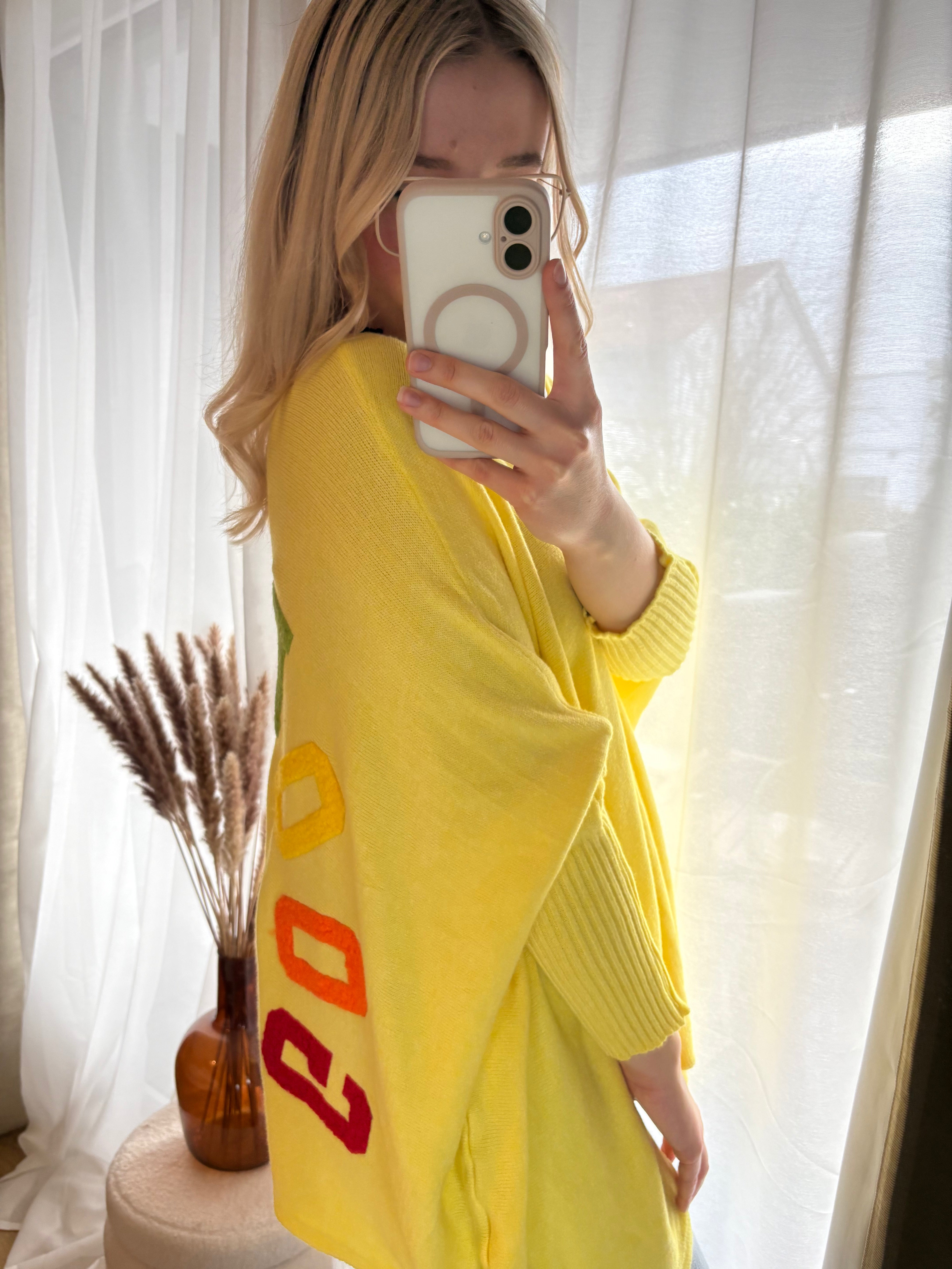 Dieser gestrickte Longpullover mit „Good Vibes“ Schriftzug vereint Komfort und Statement-Piece in einem – perfekt als Pullover oder lässiges Pulloverkleid... Lesen Sie mehr