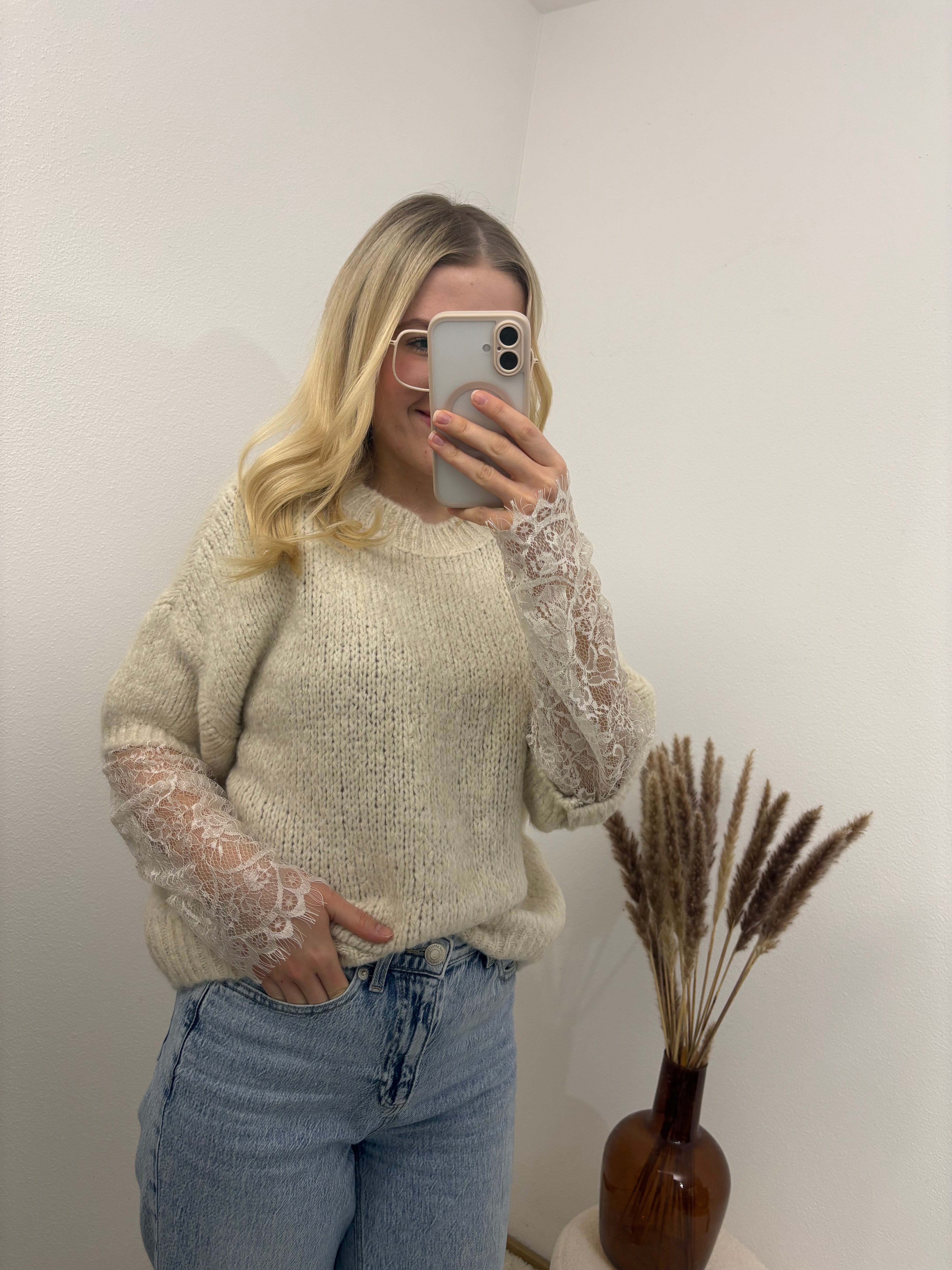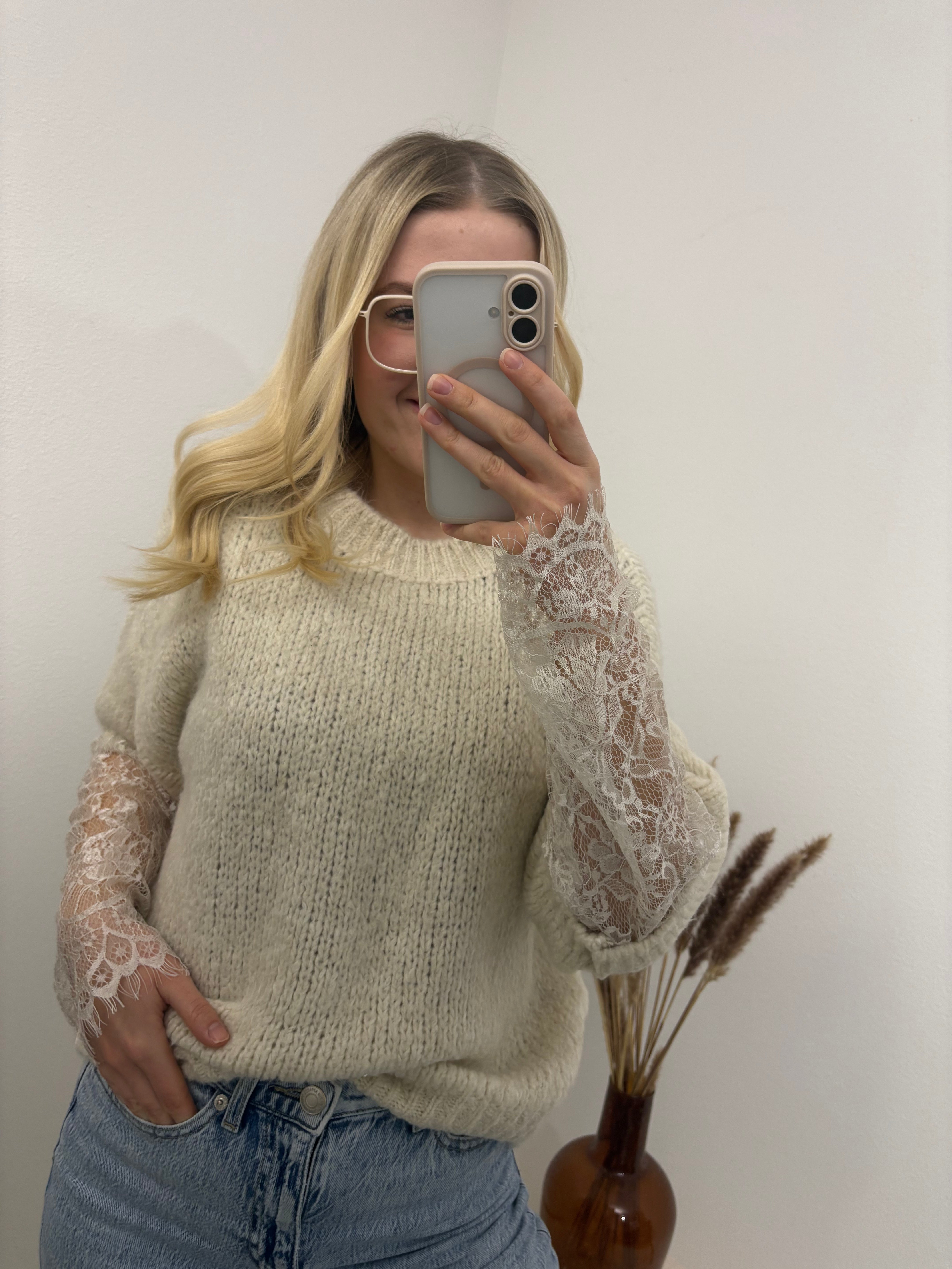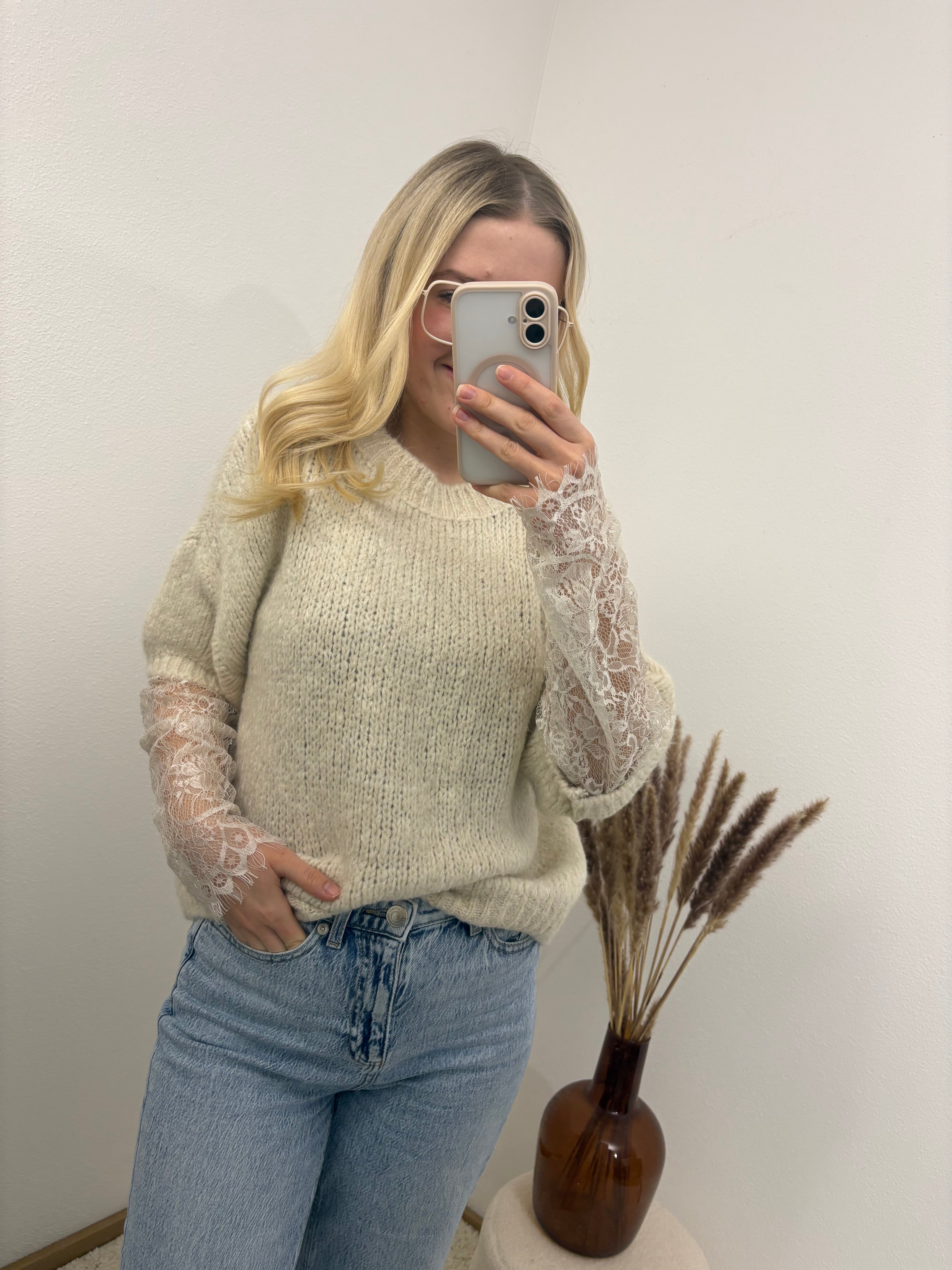 Pullover mit Spitzenärmeln Beige