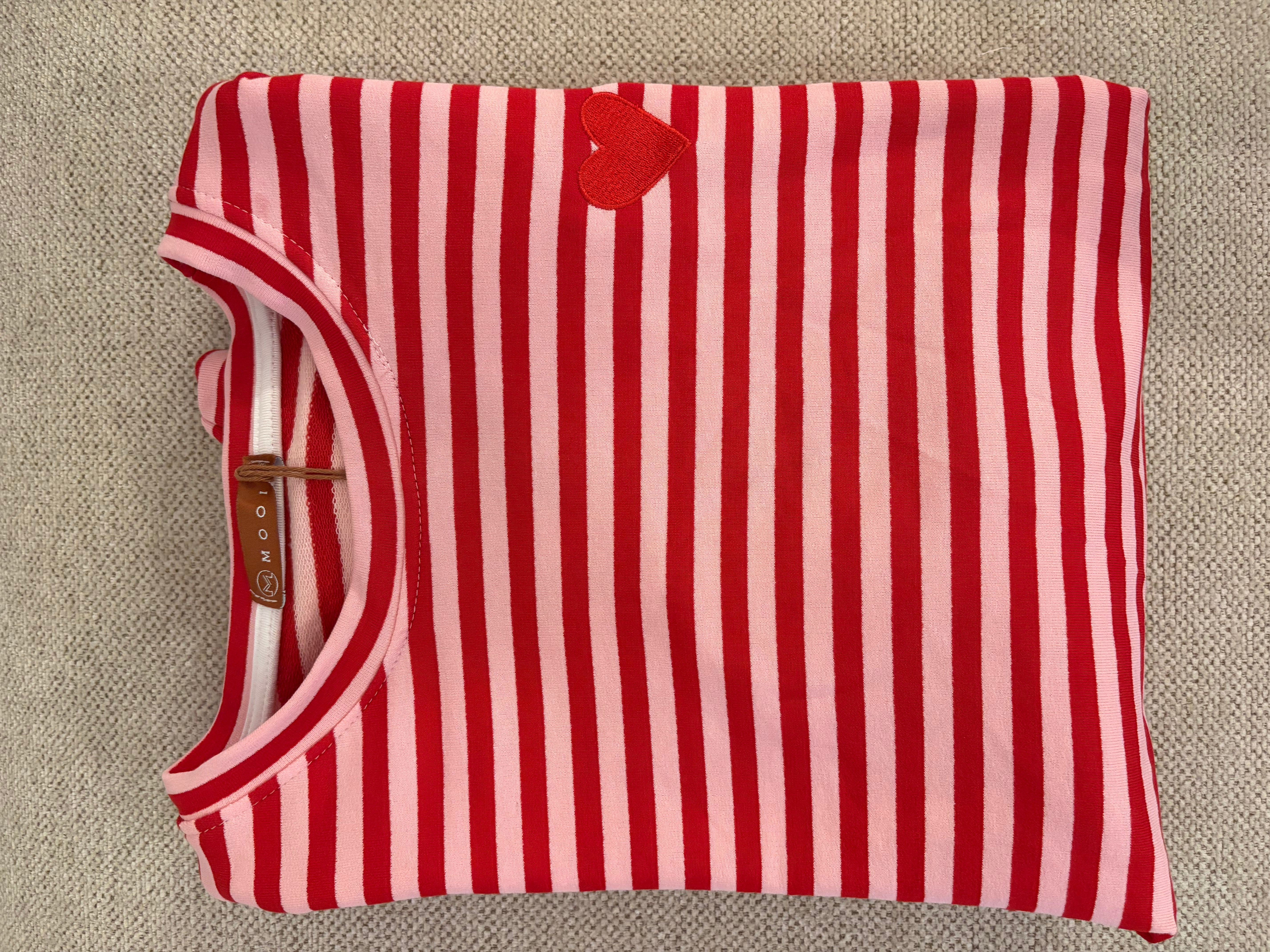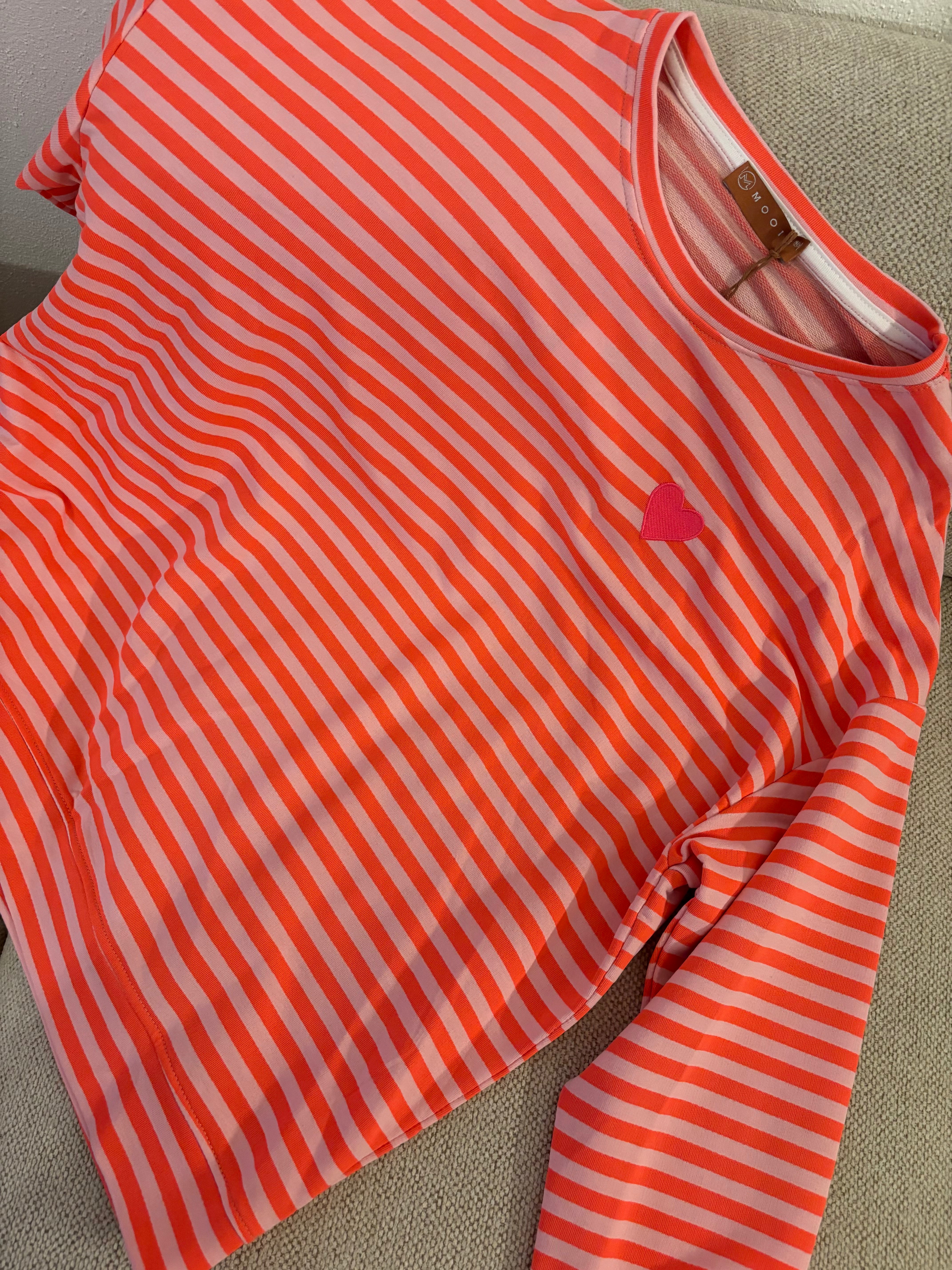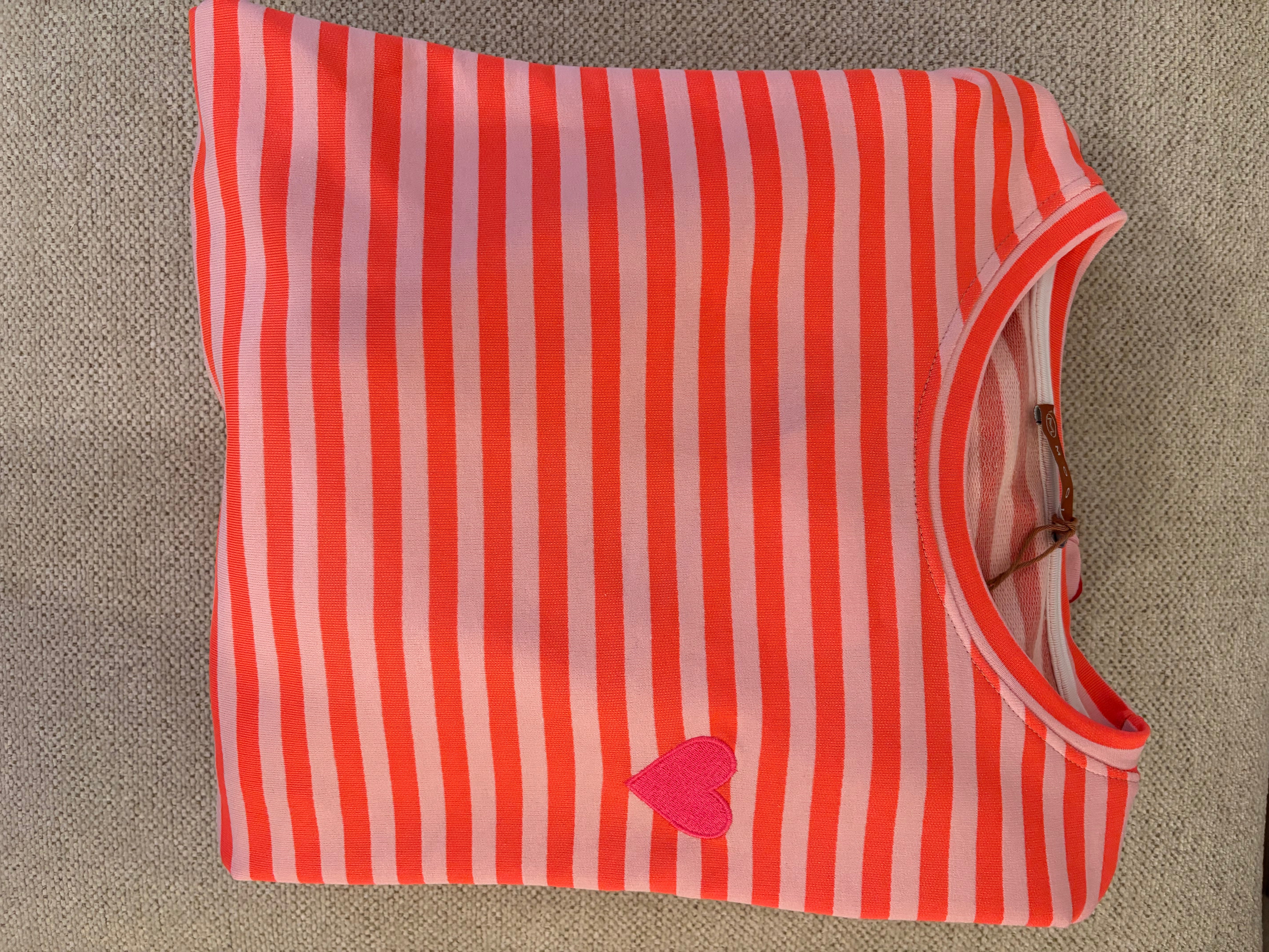Dieser gestreifte Pullover mit Herz-Stickerei ist ein verspieltes Basic für jeden Tag. • Gestreifter Sweater in Rosa-Tönen oder Rosa-Orange• Gesticktes... Lesen Sie mehr
