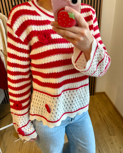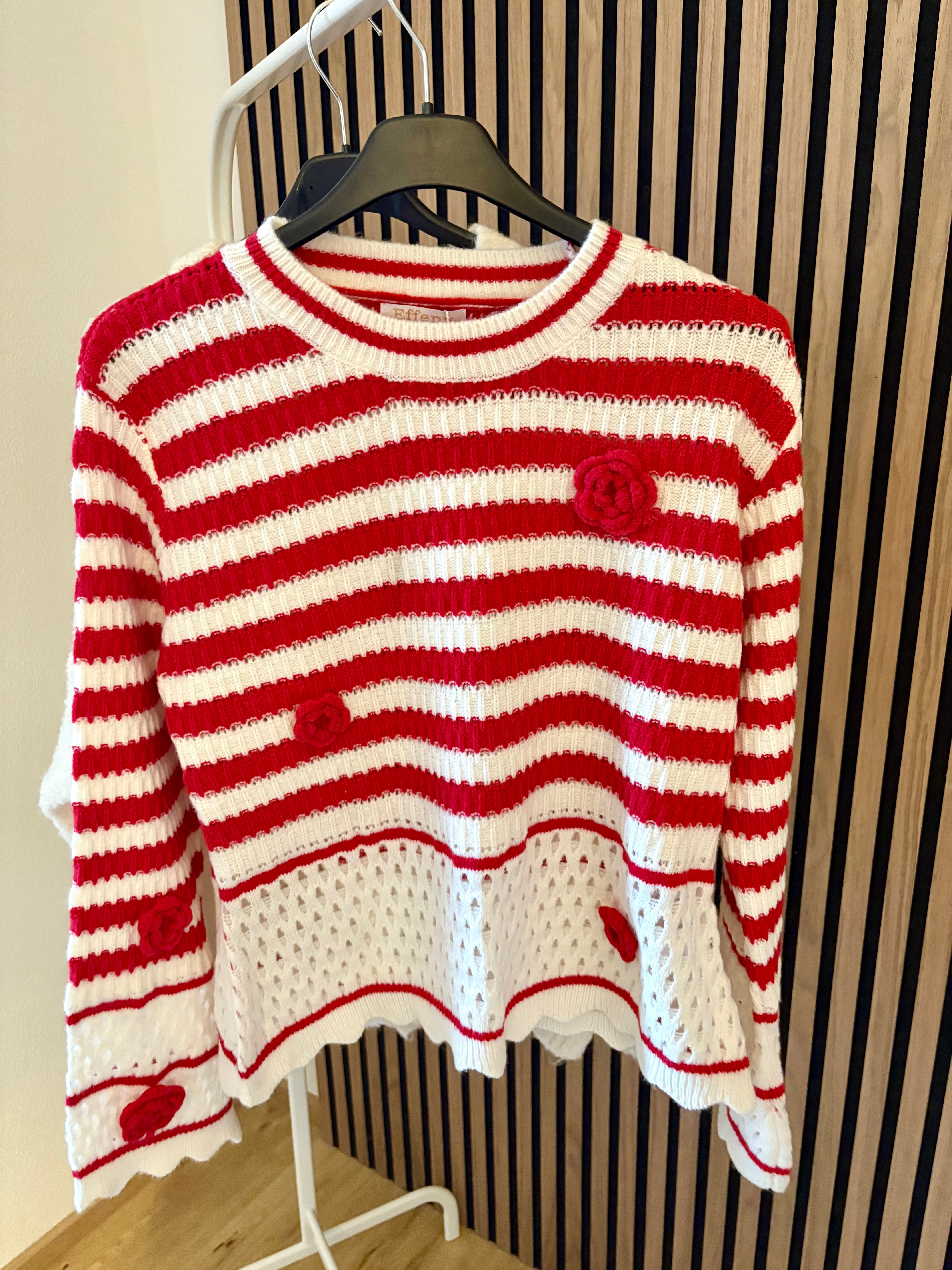 Pullover Rosi Rot Weiß gestreift Blumen Rosen