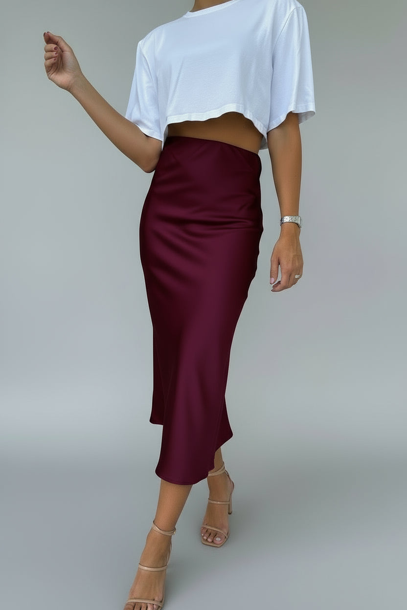Dieser fließende Satinrock in edlem Weinrot vereint feminine Eleganz mit hohem Tragekomfort. Das hochwertige Material aus 50% Polyester, 45% Viskose... Lesen Sie mehr
